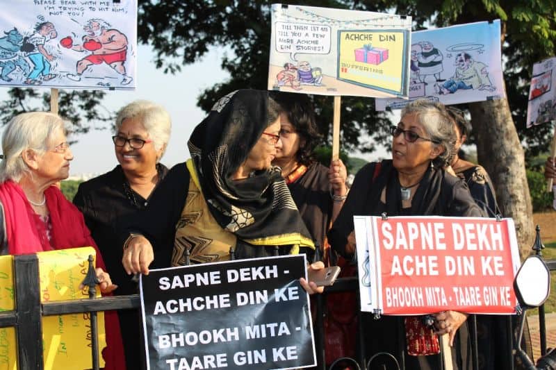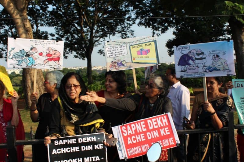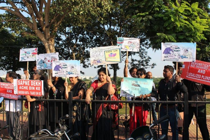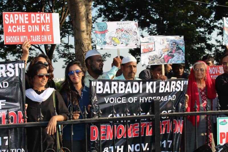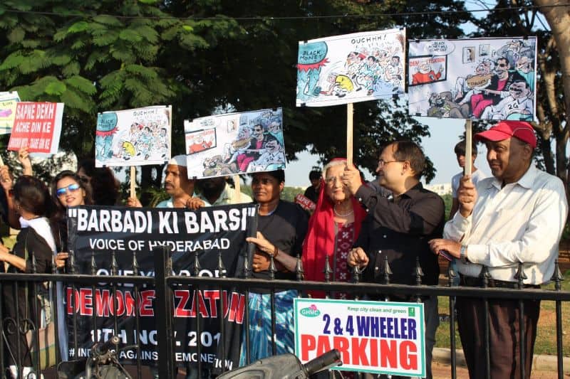 General public, Senior citizens, social activists assembled at Tank Bund on Wednesday to protest against the unprecedented move that pushed Indian economy to brink.