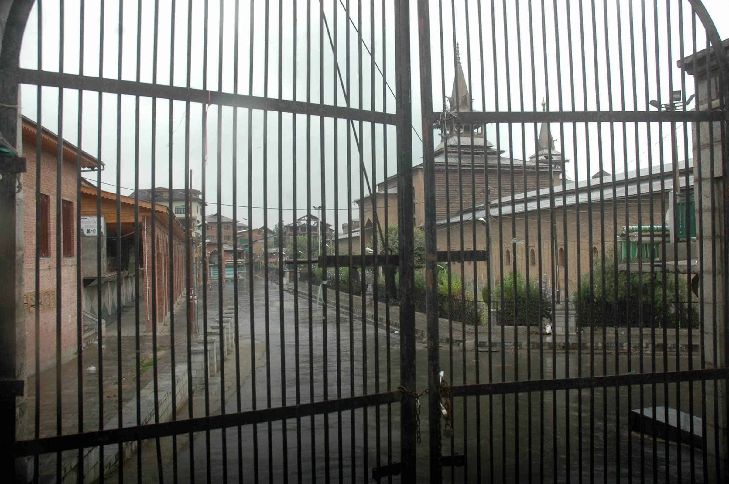 SRINAGAR, AUG 26 (UNI) Locked gate of historic Jamia masjid in down town Srinagar as no 7th consecutive Friday prayers were held. UNI PHOTO-55U
