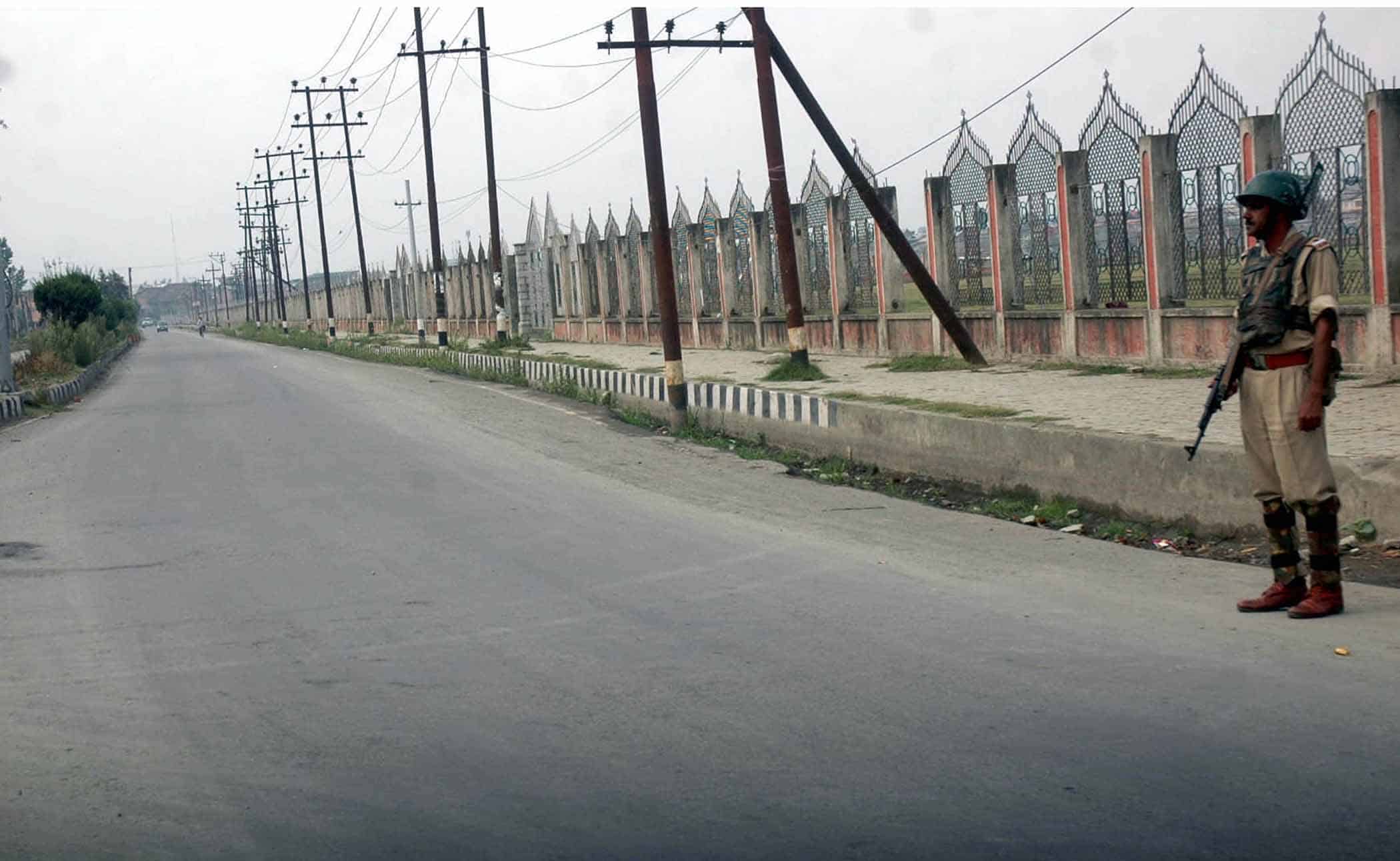 SRINAGAR, AUG 26 (UNI) Security personnel keeping vigil on the deserted street in the curfew bond area of Eid Ghah to foil Azadi March called by separatists in Srinagar on Friday. UNI PHOTO-56U