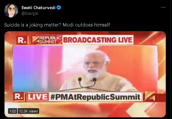 Aam Admi Party (AAP) also tweeted condemning the joke. “Imagine the insensitive disregard for human life by our Prime Minister who needs to crack a joke on suicide!?!? Ironically, when this #AnpadhPM makes a sick & cruel joke on a girl’s suicide, the nation is expected to laugh!”