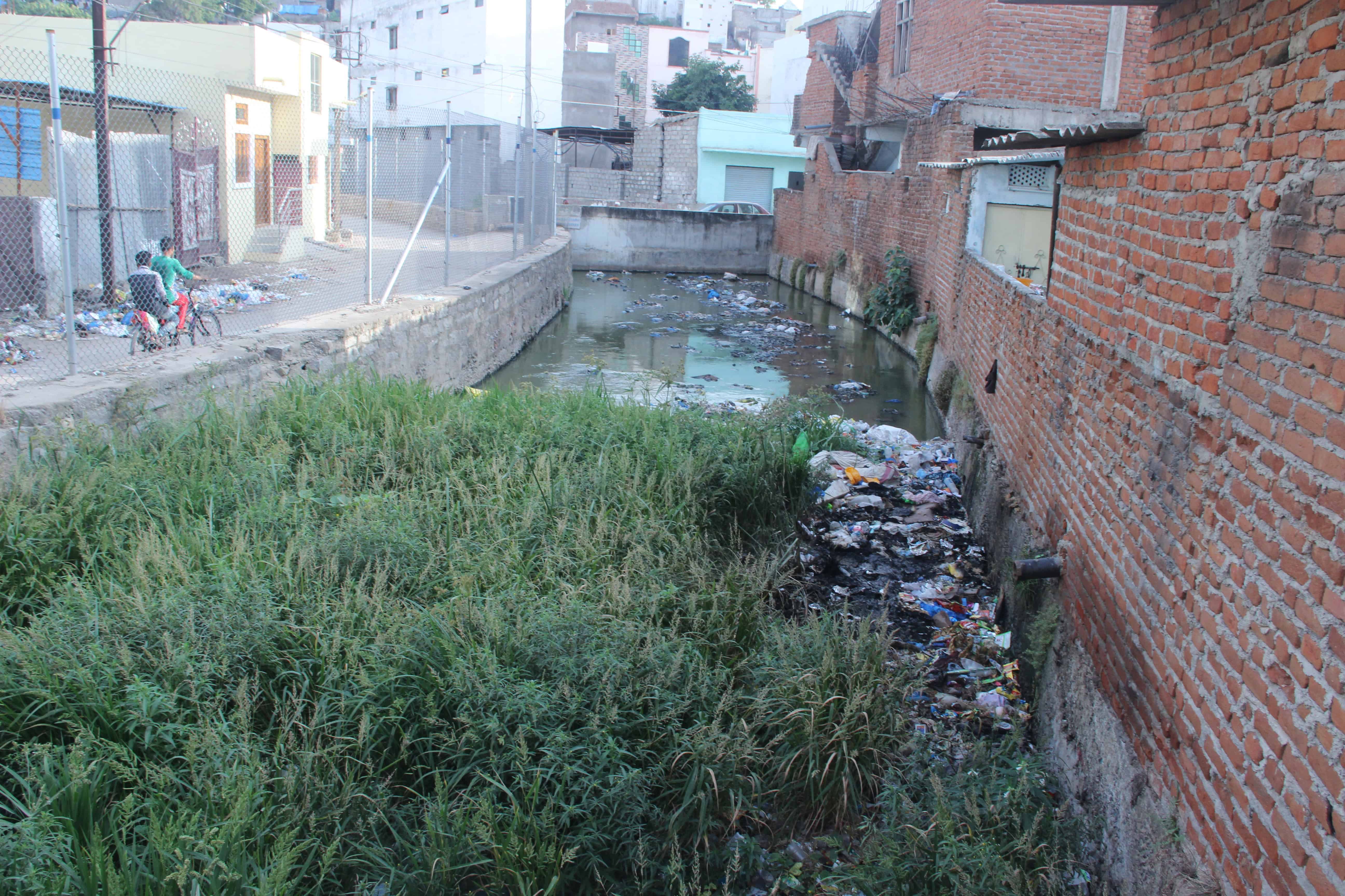 A drain has turned into a farm land at Virat Nagar in Hakimshah Colony where the grass has blocked the flow of the water that is now running on the road. .Photo:Laeeq