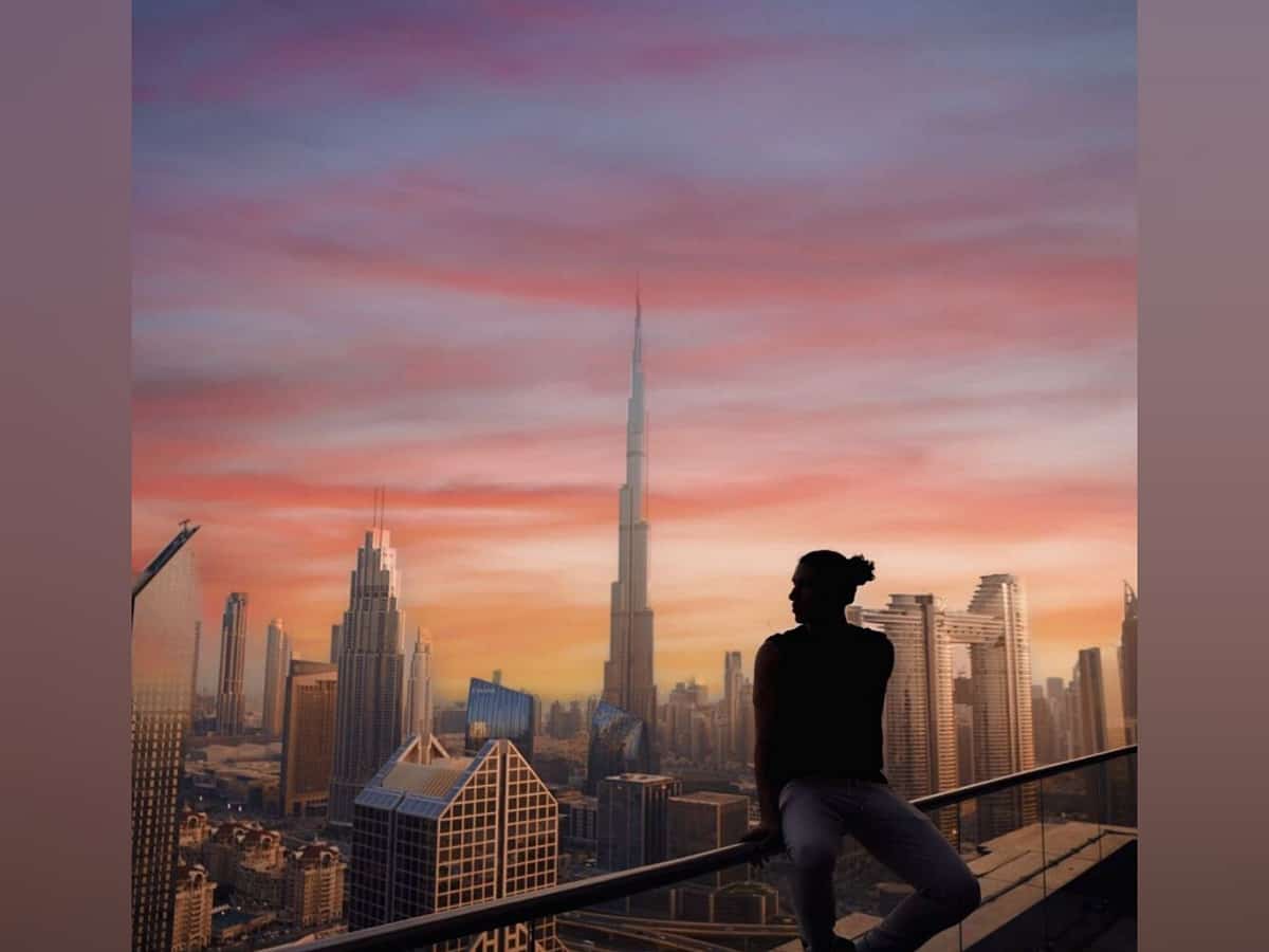 The photo, taken by Nishas Ahmed, shows one of his friend from the US sitting on a balcony railing, with Dubai’s iconic Burj Khalifa and other skyscrapers along Sheikh Zayed Road in the background.