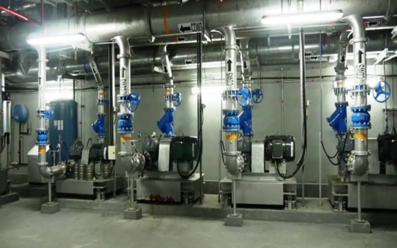 The pumps supply chilled water to the heat exchanger, air handlers, and other types of terminal devices which cool the air in their respective space.