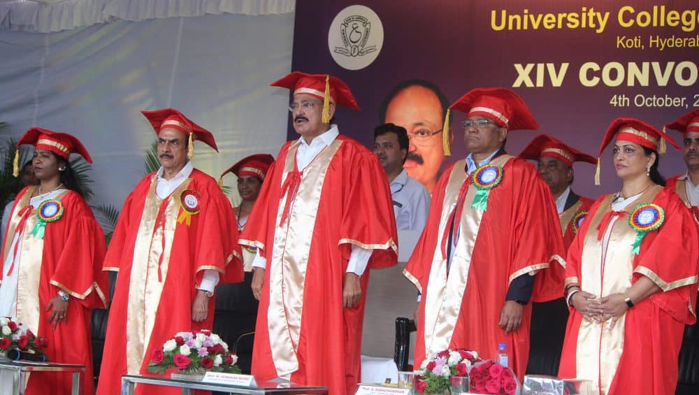 The Vice President of India, M. Venkaiah Naidu has said that education is an instrument of social transformation adding that it forms the foundation for empowering women, especially in a country like India. Delivering the Convocation address at the University College for Women in Hyderabad on October 4, 2018, he said that no country can make progress if women lag behind. Educating a woman would not only empower an individual but an entire family. Expressing his concern over gender inequality, he warned that subordination of women in various spheres would have serious negative consequences. Calling for breaking down walls and defying stereotypes, he emphasized that women, who constitute more than half the population, need to be given voice and space. “Empowering women is empowering entire humanity”, he asserted. The Deputy Chief Minister of Telangana, Mohammad Mehmood Ali, the Vice Chancellor of Osmania University, Prof S. Rama Chandram, and Principal, University College for Women, Prof. Roja Rani, members of the faculty, students and parents were present on the occasion. (Photo: Zabi)