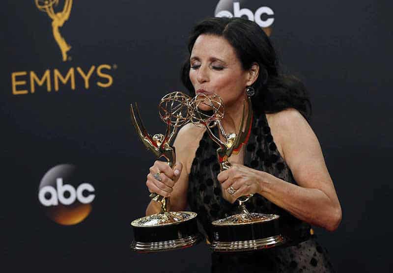 LOS ANGELES, SEP 19:- Actress Julia Louis-Dreyfus poses backstage with her awards for Outstanding Comedy Series and Outstanding Lead Actress In A Comedy Series for her role in HBO’s “Veep” at the 68th Primetime Emmy Awards in Los Angeles, California U.S., September 18, 2016. REUTERS-6R