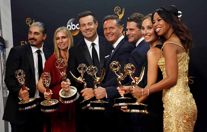 Producer Mark Burnett (C) and host Carson Daly (3rd L) pose with his team backstage with their award for Outstanding Reality-Competition Program for “The Voice” at the 68th Primetime Emmy Awards in Los Angeles, California U.S., September 18, 2016. REUTERS
