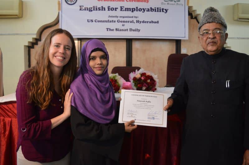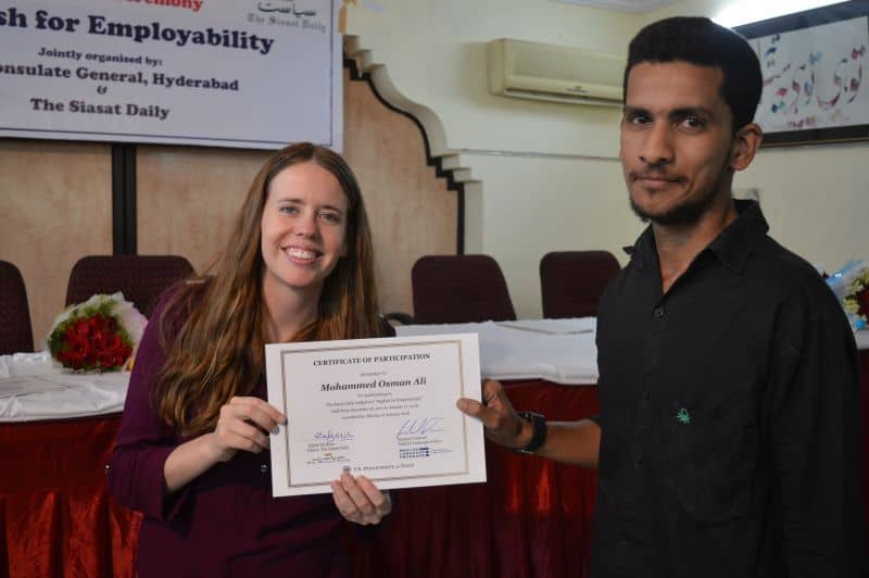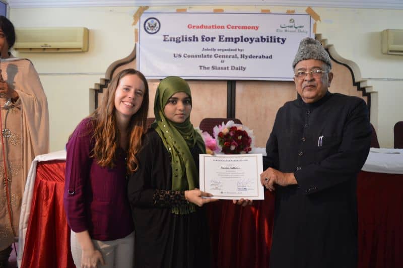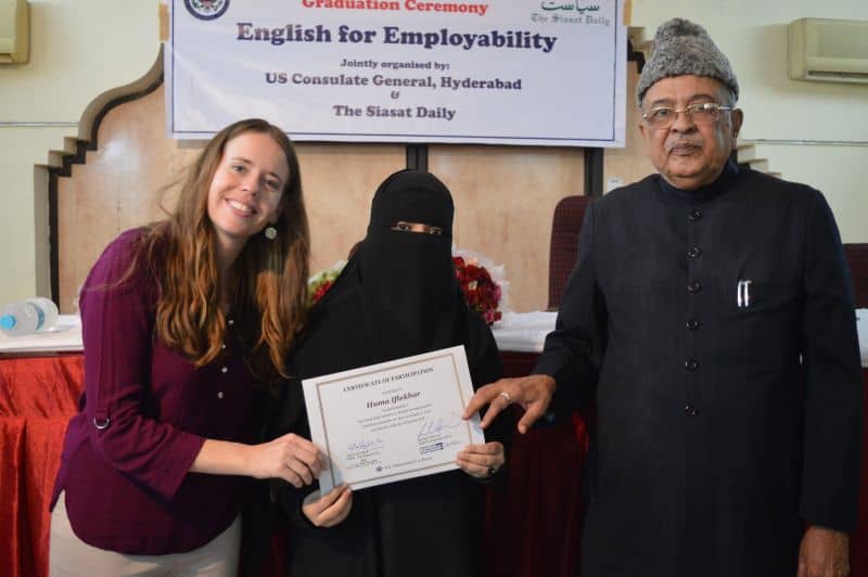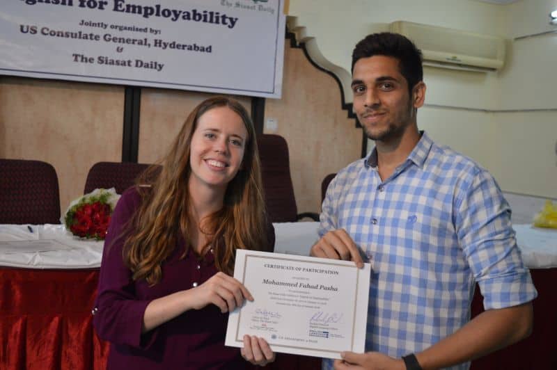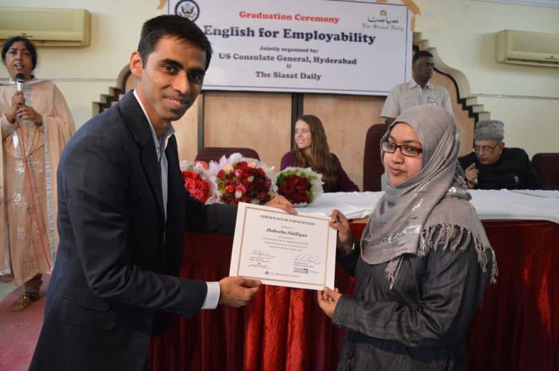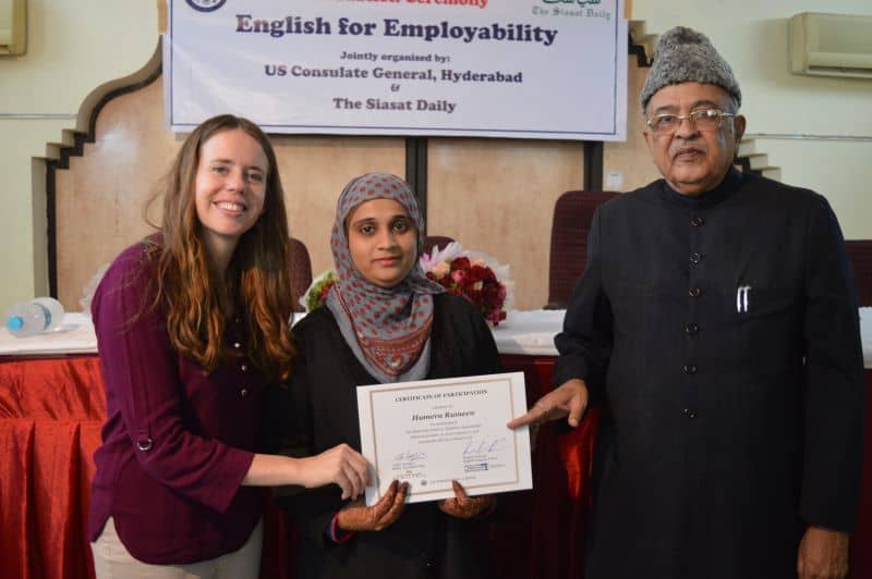 Two more batches of English proficiency course named, ‘English for employability’ concluded on Thursday. US Consul General Katherine Hadda, Editor Siasat Mr. Zahid Ali Khan, Asst. Public Affair Officer, Mr. Akash Suri give away the certificates. The course was jointly conducted by Siasat daily and American Consulate. The course was conducted from December 18, 2017 to January 17, 2018. Ms. Rachael Dimond led the batches. (Pics. Murli)