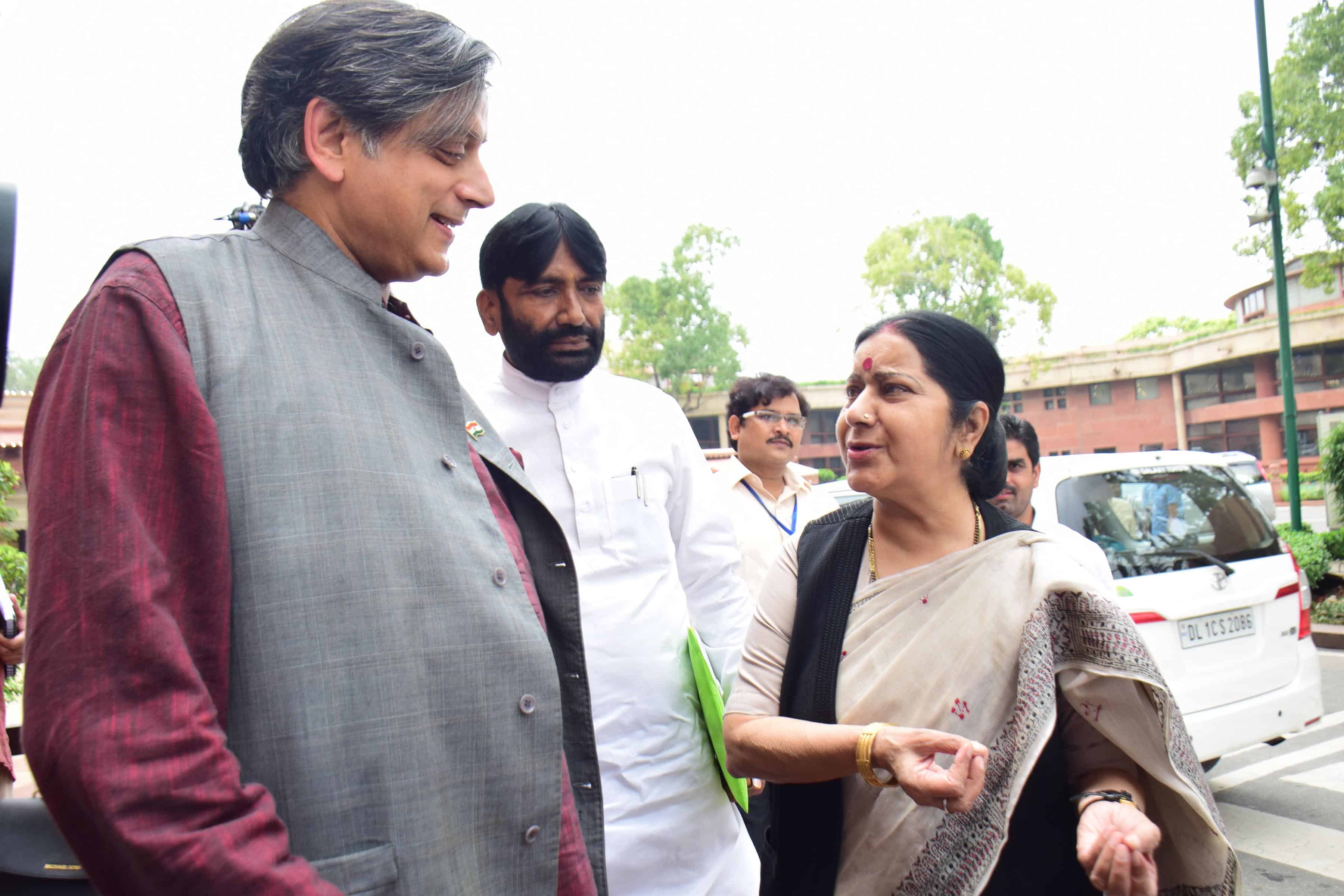 NEW DELHI, AUG 12 (UNI):- External Affairs Minister Sushma Swaraj in conversation with Congress leader Sashi Tharoor outside the Parliament house building in New Delhi on Friday. UNI PHOTO-77U