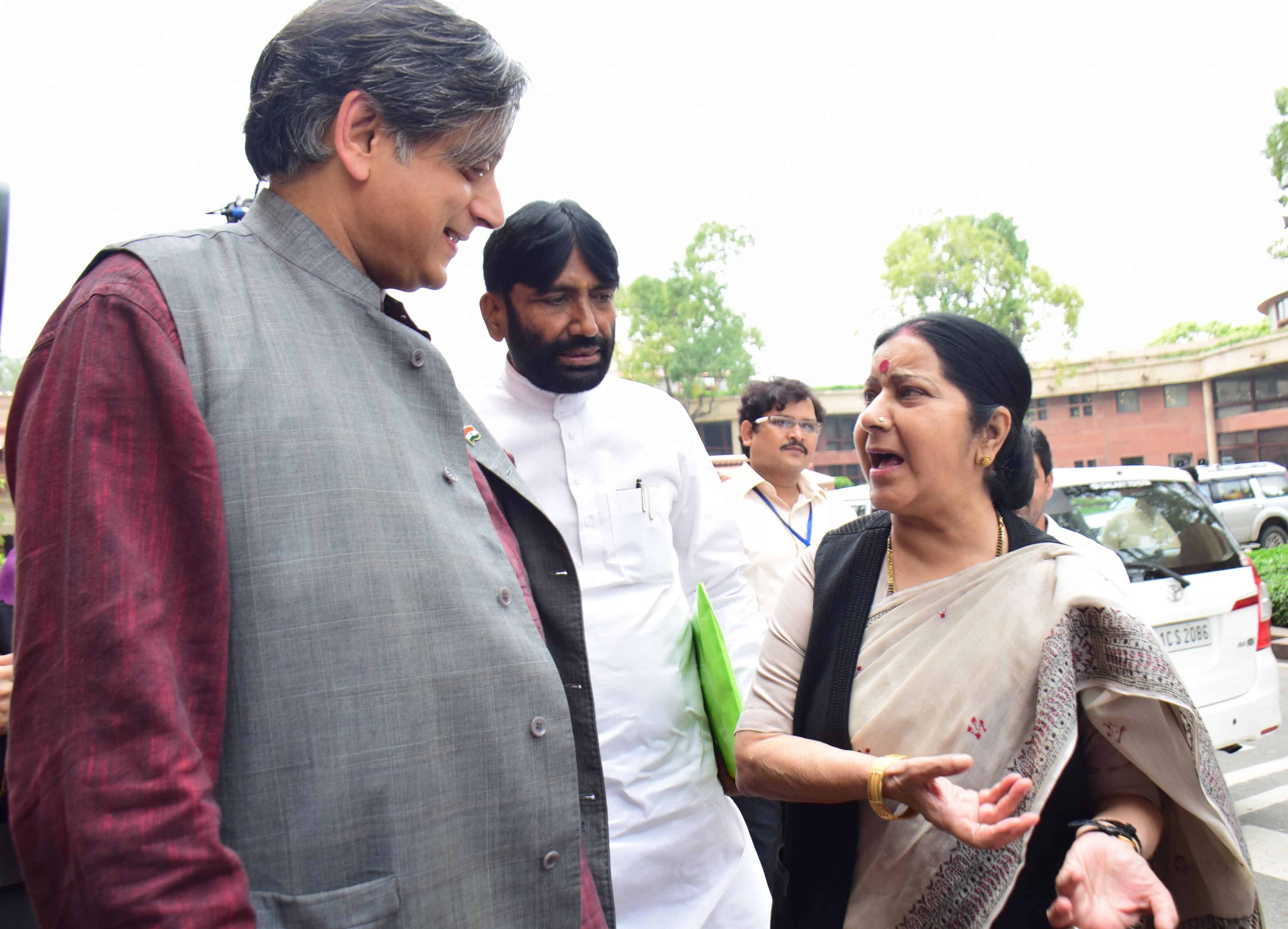 NEW DELHI, AUG 12 (UNI):- External Affairs Minister Sushma Swaraj in conversation with Congress leader Sashi Tharoor outside the Parliament house building in New Delhi on Friday. UNI PHOTO-76U
