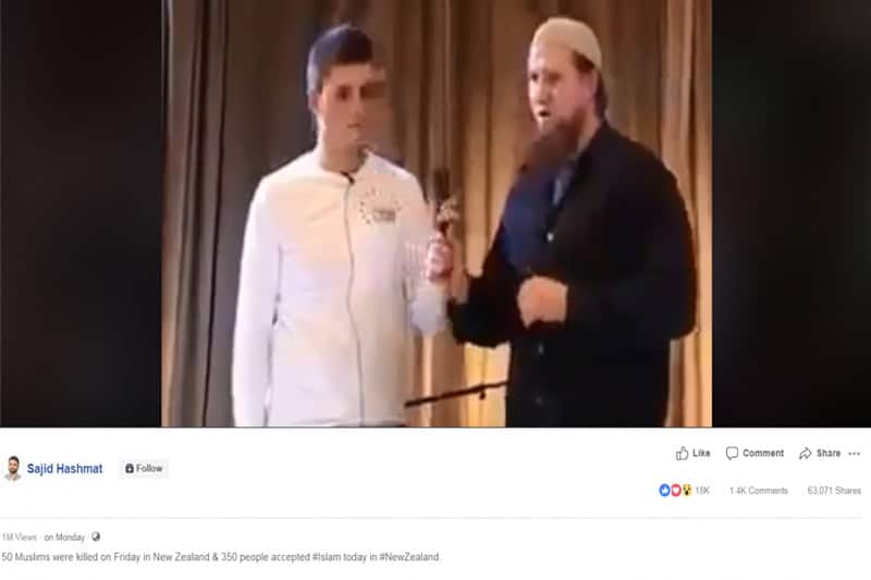The caption alongside the video in the misleading Facebook post states in English: “50 Muslims were killed on Friday in New Zealand & 350 people accepted #Islam today in #NewZealand.”