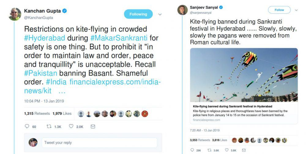 The syndicated article spurred an uproar on social media about Hindu religious beliefs being targeted in India. Sanjeev Sanyal tweeted an article by The Financial Express suggesting that the Hindu religious belief are vanishing from the Indian culture. Kanchan Gupta also tweeted the article highlighting the ‘prohibition’ on kite-flying and later clarified without deleting the original tweet.