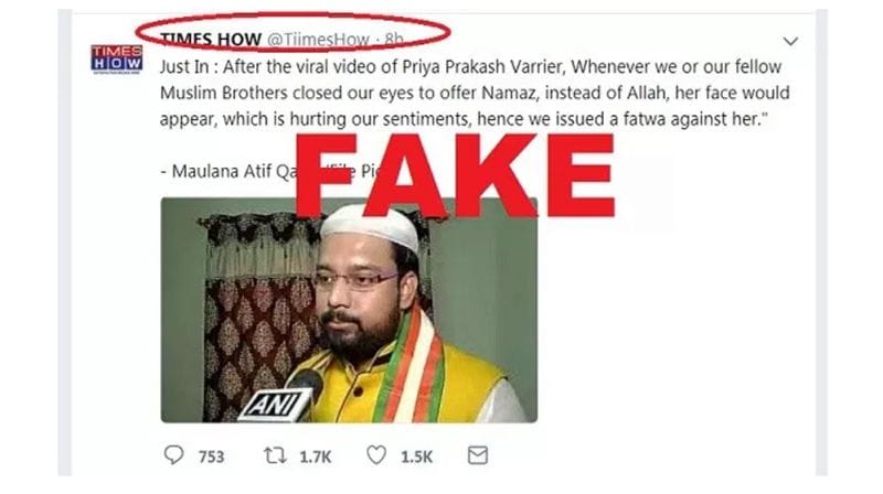 NEW DELHI: After Malayalam actor Priya Prakash Varrier becomes an internet sensation, a fake news is going viral on Whatsapp and social media platforms that a fatwa has been issued against her.
