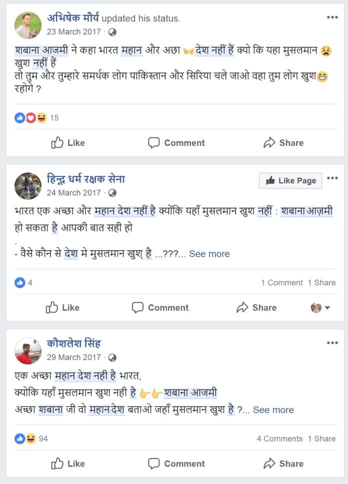Translation: India is not a good and great country, because the Muslims are not happy here – Shabana Azmi Shabana Azmi, you and your supporters go to Syria and Pakistan so that you agree to get the real happiness as well, then by sharing, answer these people – Santosh Bhartiya