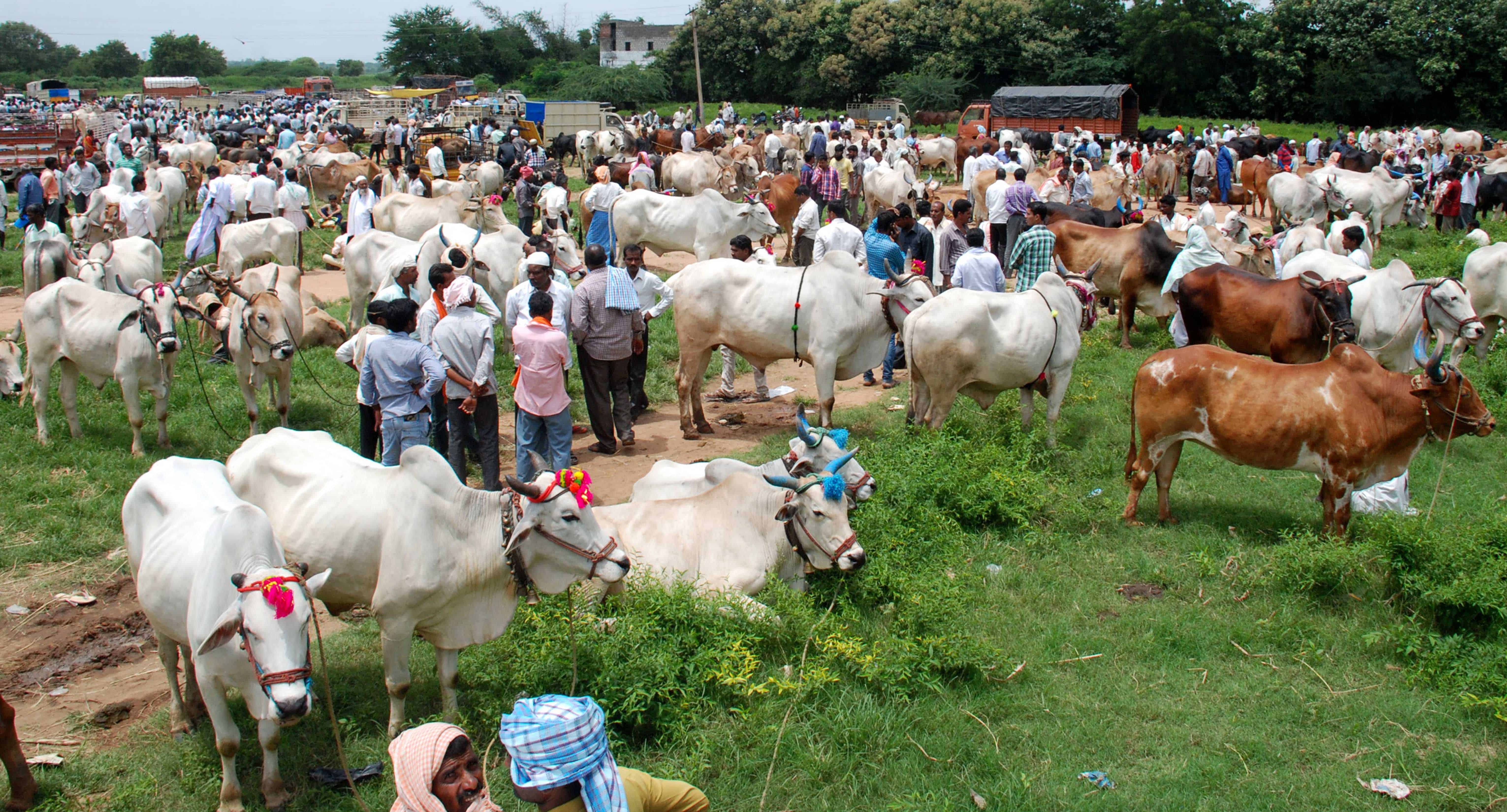 Farmers with their Cow & Bull for Sale ahead of the Eid Al Azha at Sunday Bazar in Sangareddy of Medak district in Telangana .