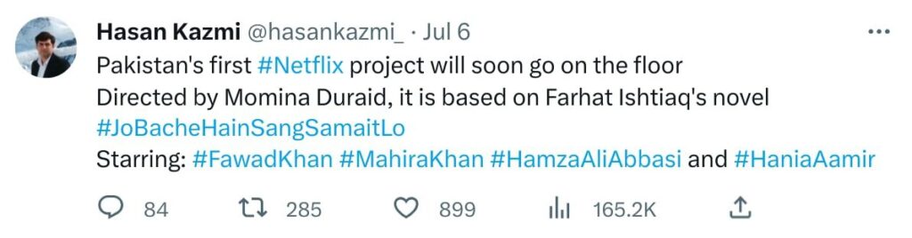 According to various reports, The cast of Farhat Ishtiaq’s novel-based drama serial, Jo Bachy Hain Sang Samait Lo, also includes Mahira Khan and Fawad Khan. Along with them, it will also include Hamza Ali Abbasi and Hania Aamir. The news was first shared by Hasan Kazmi on Twitter.