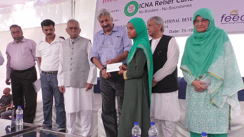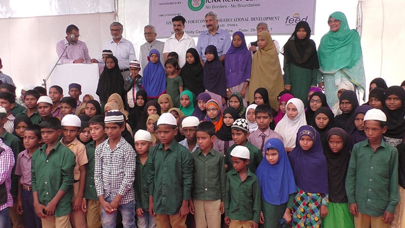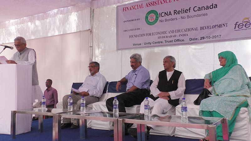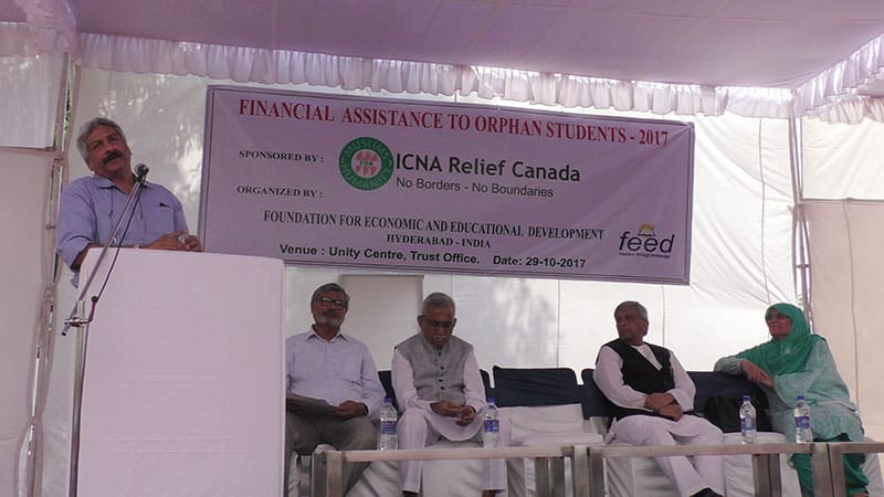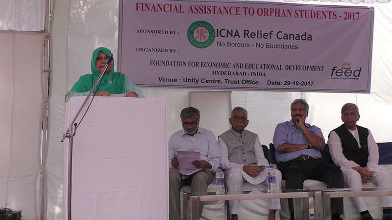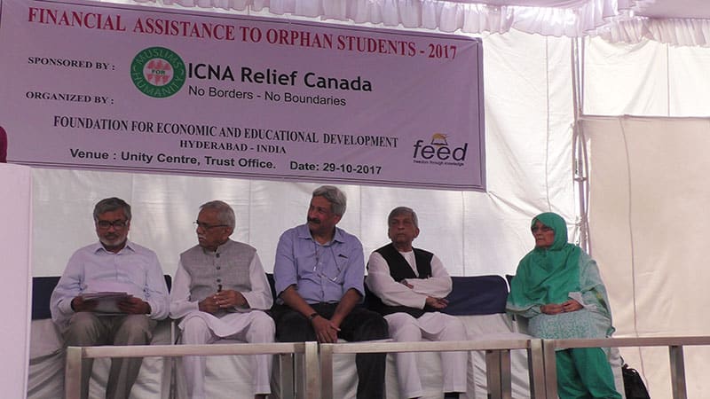 FEED and HZCT organised disbursement program of Financial Assistance -2017 to 1000 Orphan Students by ICNA relief Canada at Unity Centre, FEED, Begumpet. Mr. S.A. Huda, IPS(retd.), Ex-DGP, Mr. B Shafiullah, IFS, MD. TSMFC, and Mrs. Nafees Khan, Member ICNA relief, Canada were present. (Photo by Mohd Faheem)