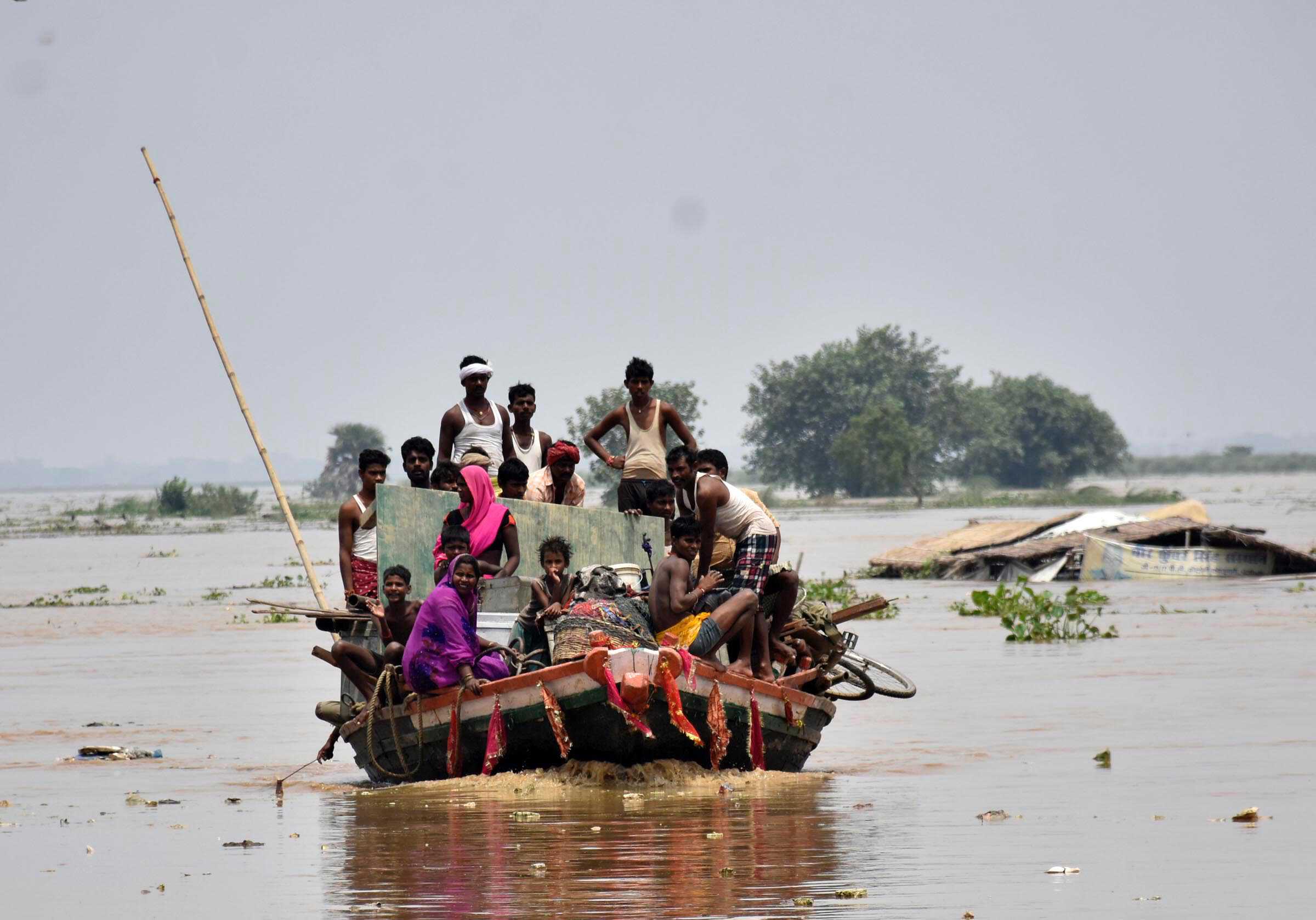 PATNA, AUG 20 (UNI):-Flood affected people with their belongings, sit in a boat to move to safer places,in Patna on Saturday. UNI PHOTO-65U