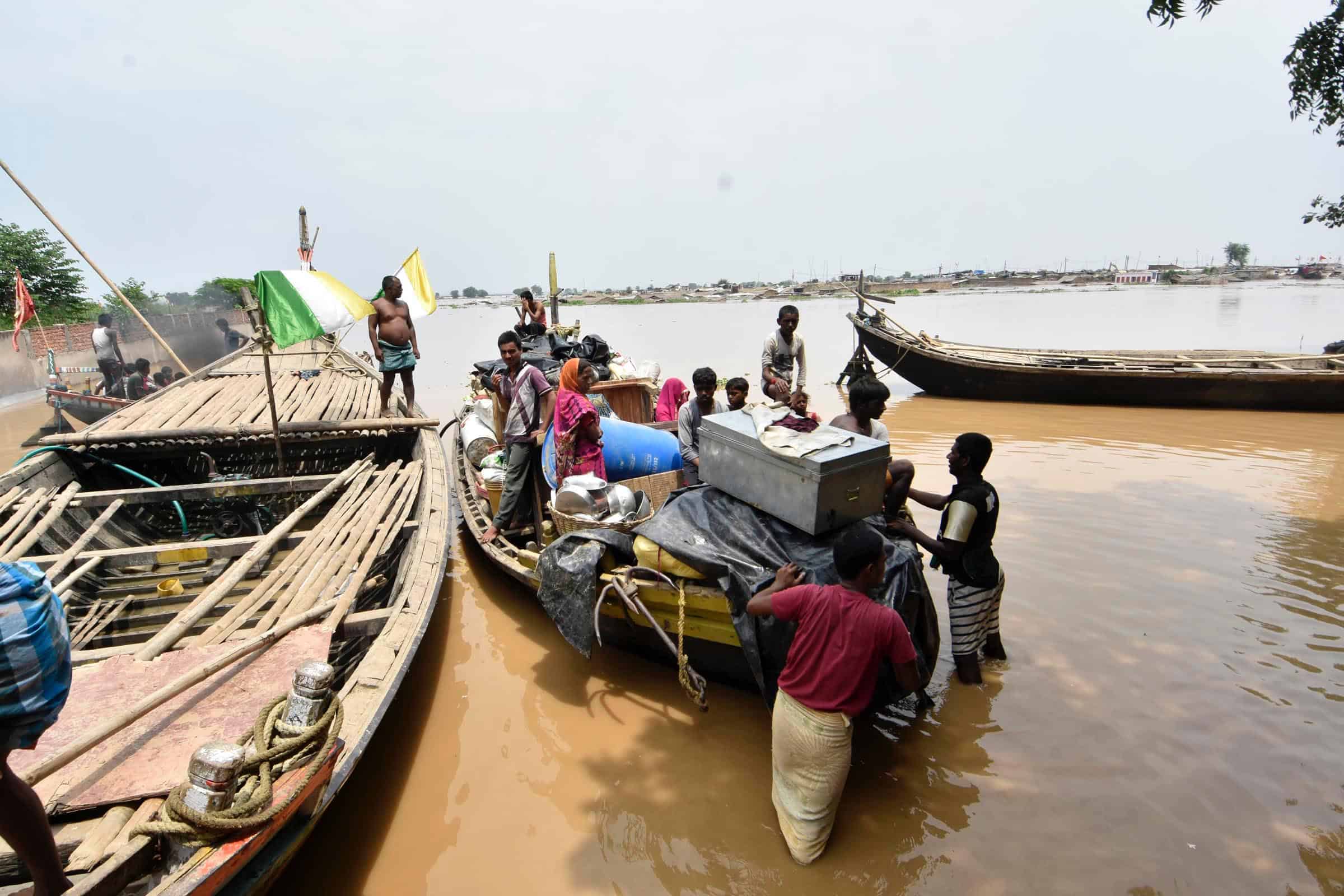 PATNA, AUG 20 (UNI):-Marooned people with their belongings shifting to a safer place as their houses submerged in flood water,in Patna on Saturday. UNI PHOTO-66U