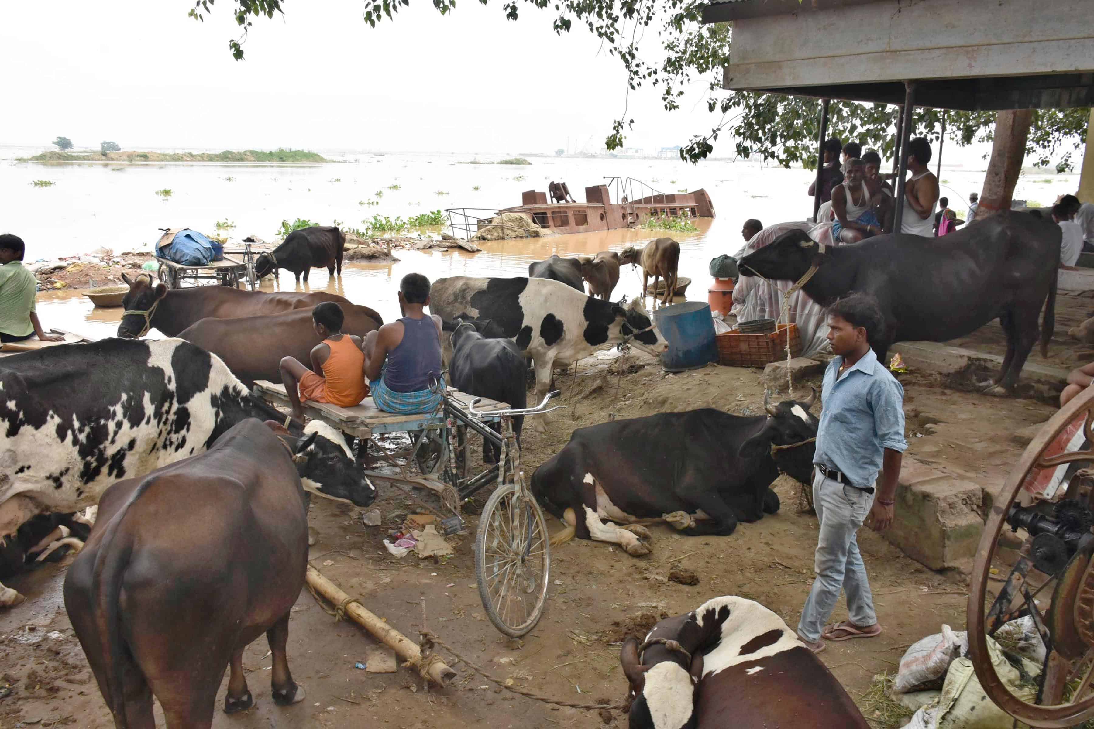 PATNA, AUG 20 (UNI):-Villagers with their cattles take shelter at a safer place, after their village submerged in flood water,in Patna on Saturday. UNI PHOTO-69U