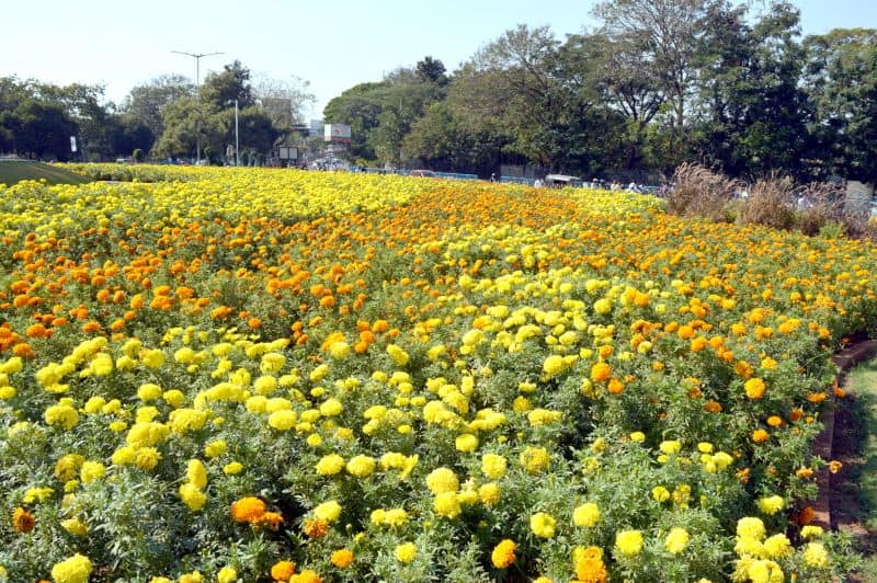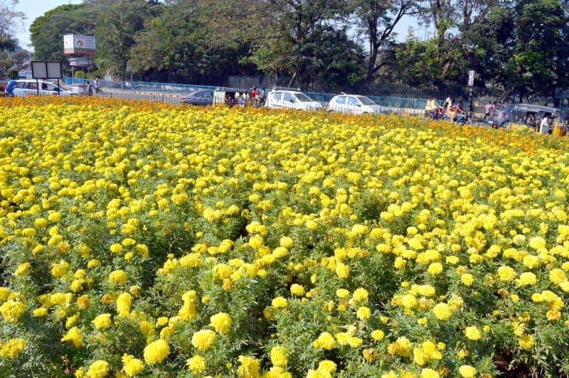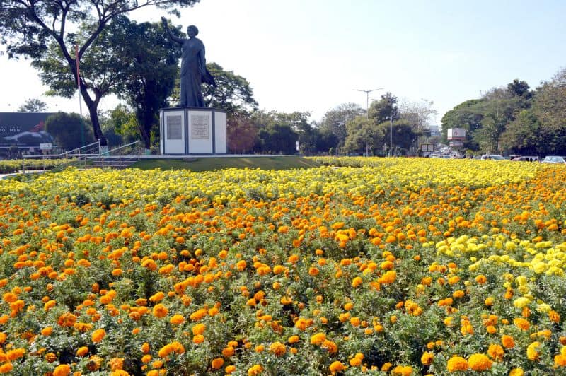A flower bed is laid beautifully near Indira Gandhi statue near at necklace road junction.(Photo: Murli)