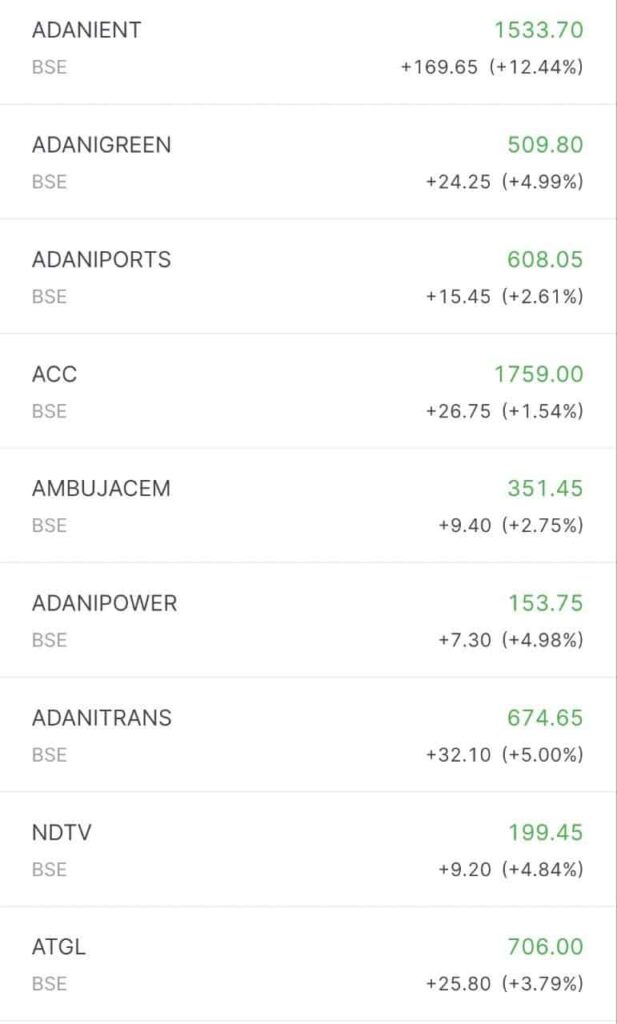 The stocks of other Adani Companies such as Adani Ports, ACC, Ambuja Cements, Adani Total Gas Limited are also trading in green.