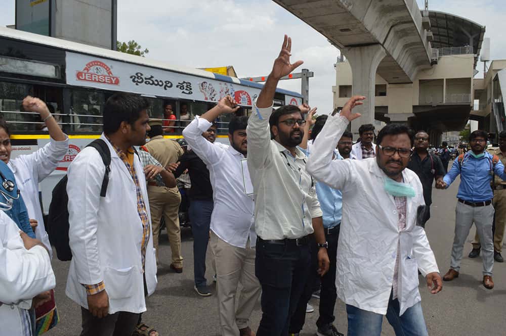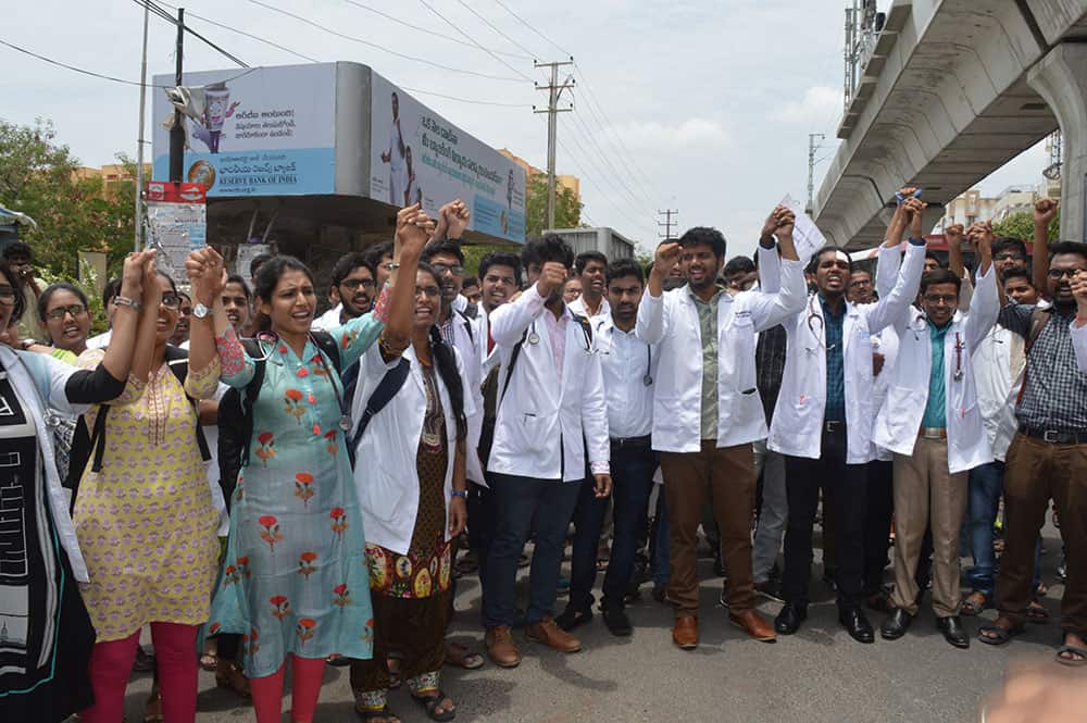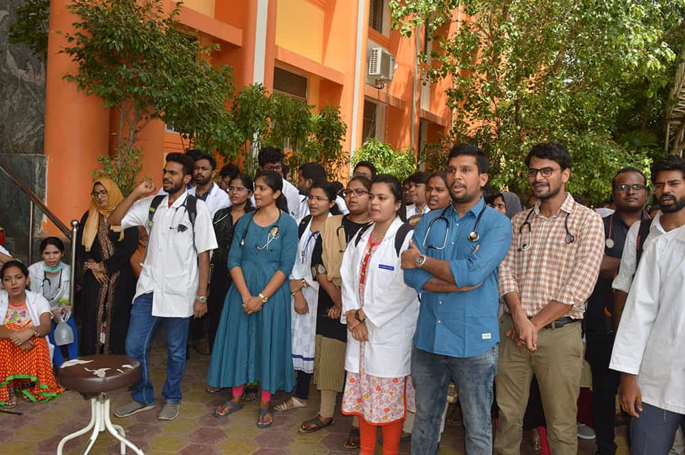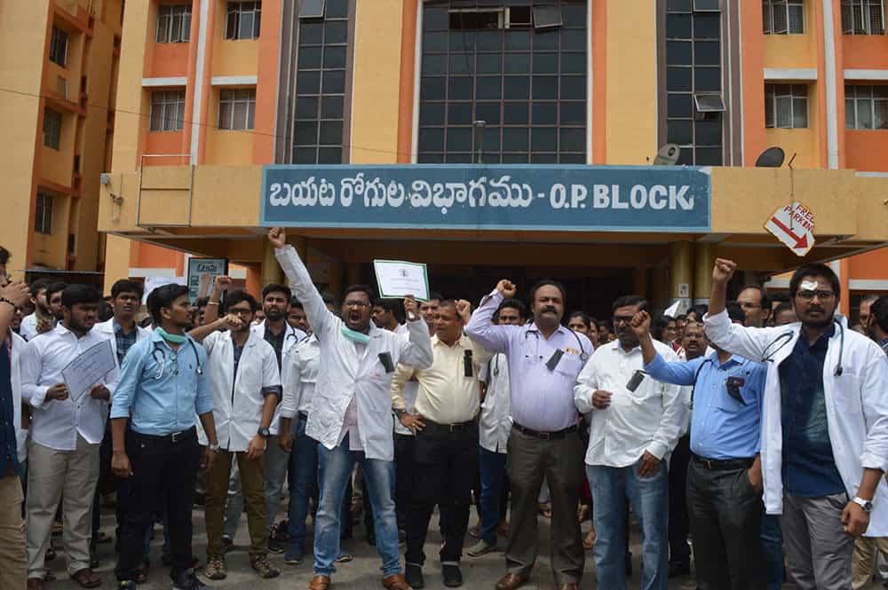 Doctors in the government-run Gandhi Hospital, Hyderabad on Monday staged protests to express their solidarity with the protesting doctors in Kolkata. (Photo: A Murali)