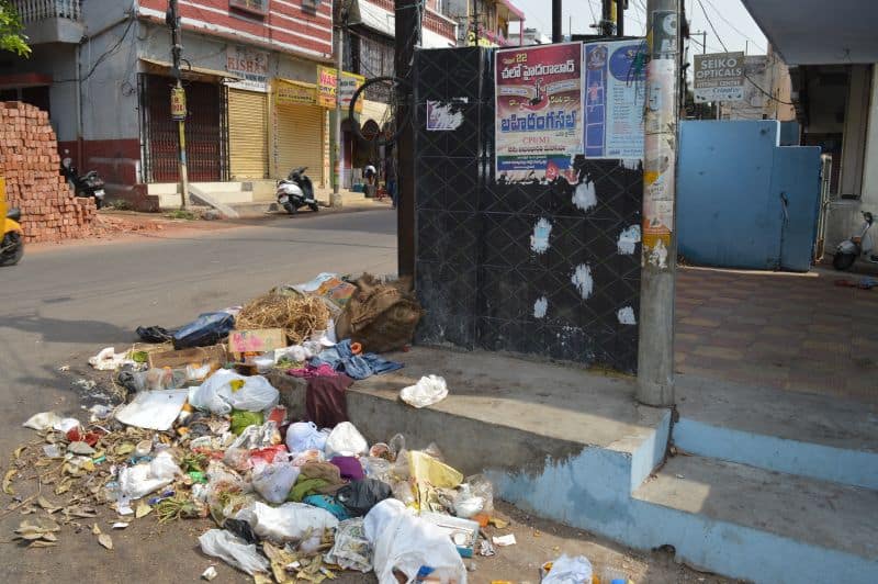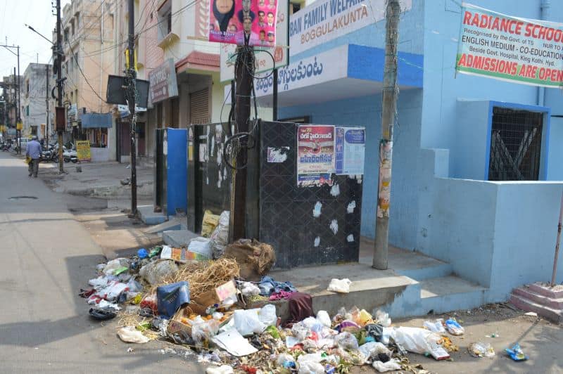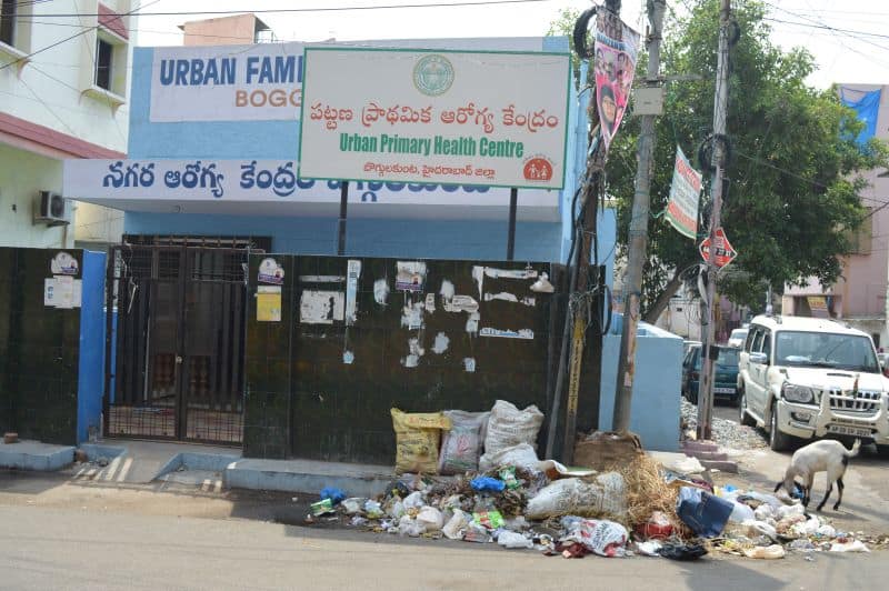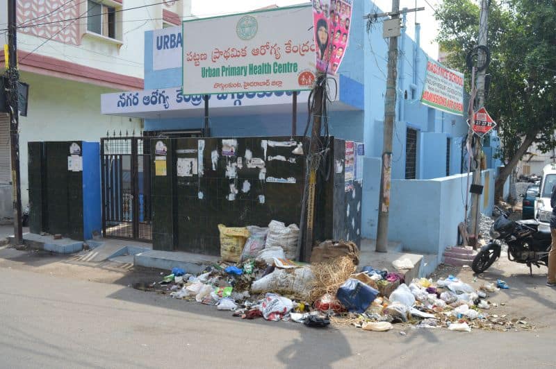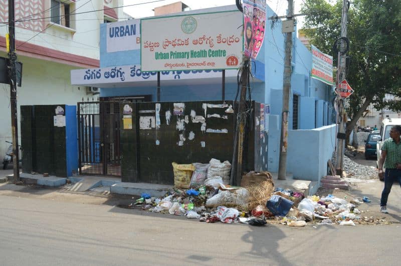 Garbage heaps can be seen near the entrance of Urban Family welfare centre, Boggulkunta Neither GHMC staff nor Medical staff is worried about it (Photo: Murli)