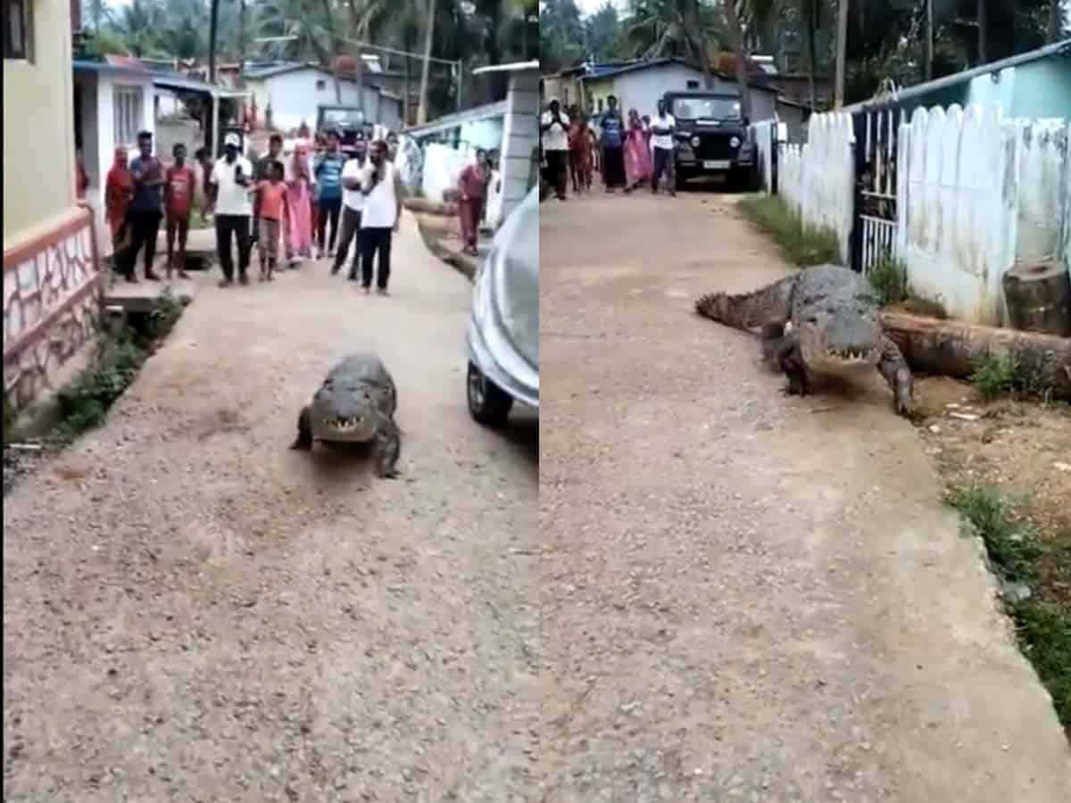 Uttara Kannada (Karnataka): Karnataka’s Kolage had a unique but unexpected visitor – a giant crocodile, who strolled through the village before heading back to its usual habitat, as per a video clip which went viral on various social media platforms on Thursday.