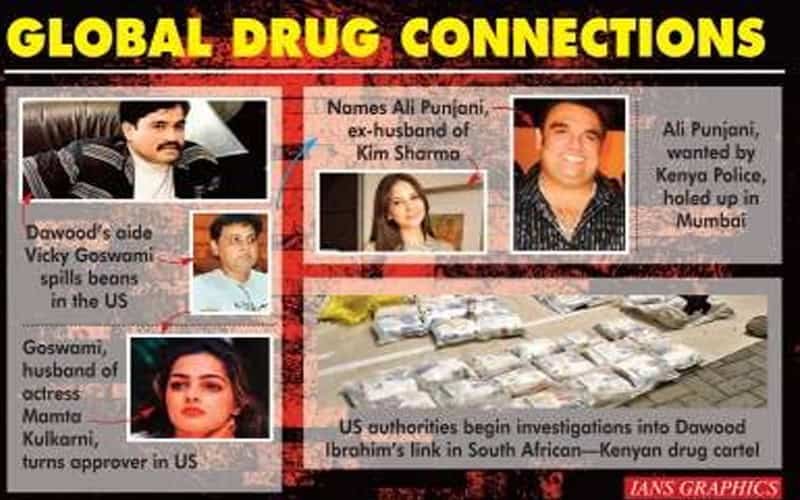 The report of the DEA reveals that Vicky Goswami, a druglord working for the D-company in South Africa, later shifted his base to Kenya from where he smuggled huge quantities of mandrax, cocaine, hashish, heroine and ephedrine. He initially worked for the Ibrahim Akasha syndicate in Mombasa and later partnered with Ali Punjani, alleged drug kingpin and husband of Kim Sharma.