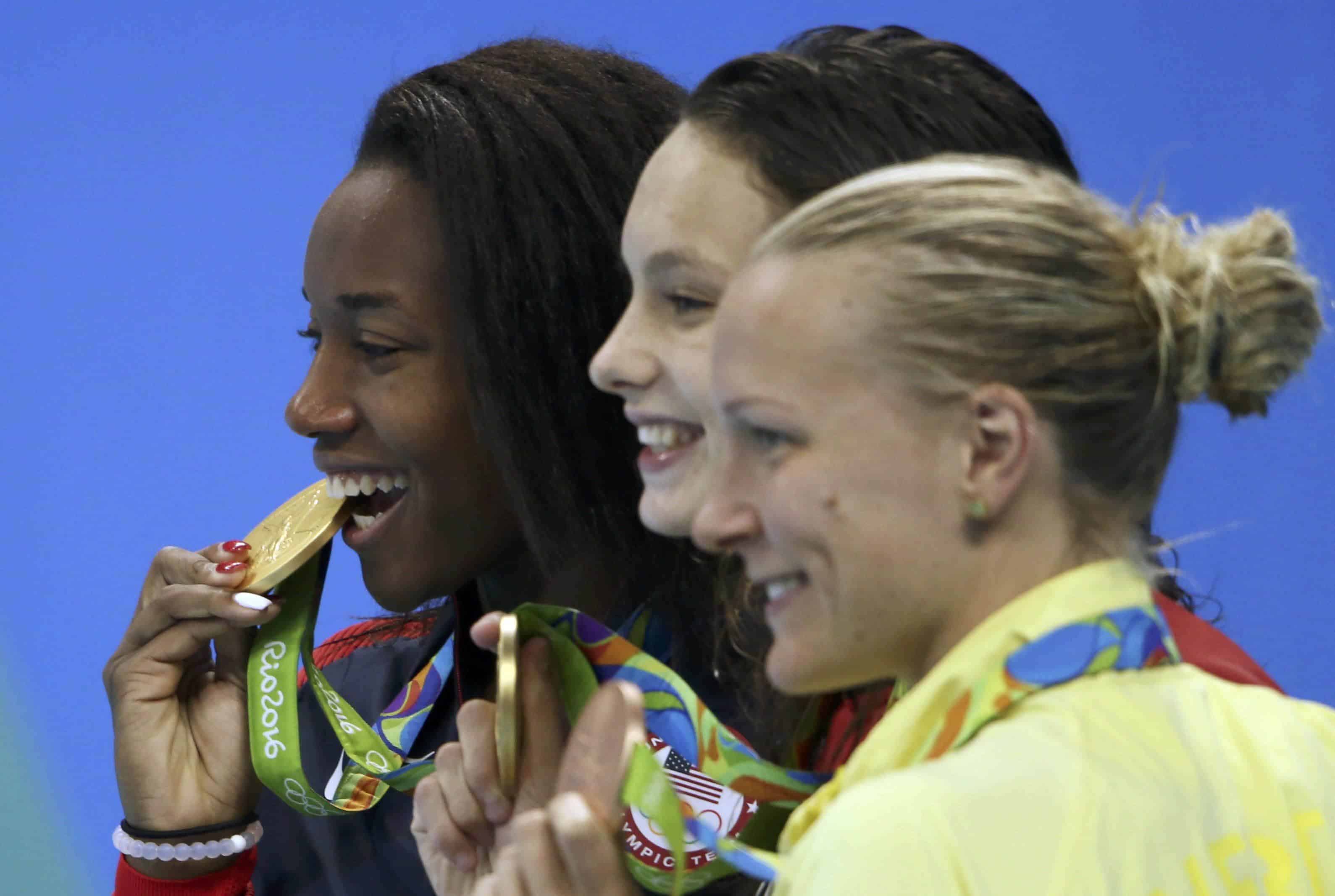Joint gold medalists Simone Manuel of USA and Penelope Oleksiak of Canada and bronze medallist Sarah Sjostrom of Sweden pose with their medals during 2016 Rio Olympics Swimming Victory Ceremony Women’s 100m Freestyle Rio de Janeiro, Brazil, 11/08/2016. REUTERS