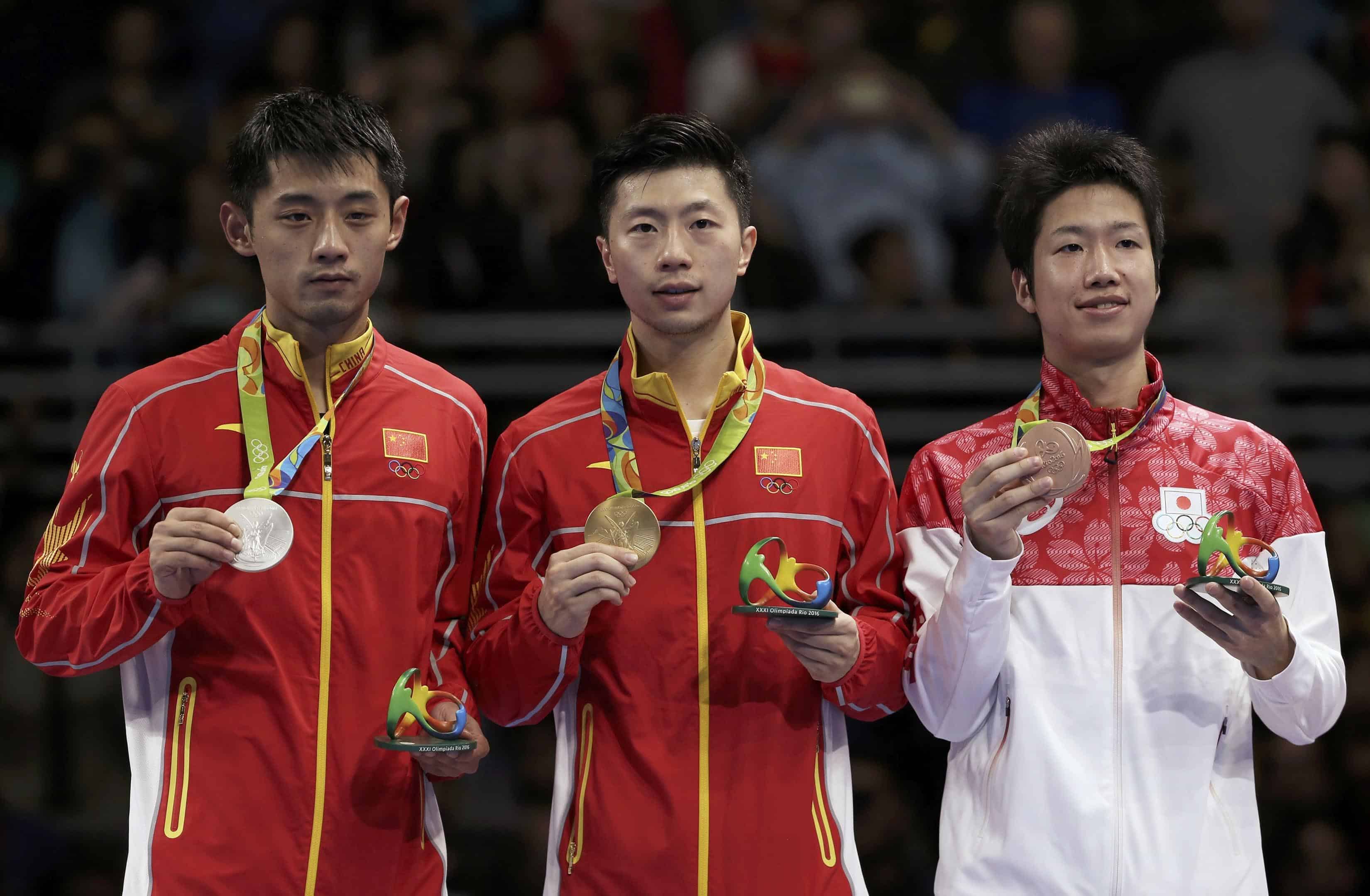 RIO DE JANEIRO, AUG 12:- Gold medallist Ma Long of China poses with silver medallist Zhang Jike of China and bronze medallist Jun Mizutani of Japan during 2016 Rio Olympics Table Tennis Men’s Singles Victory Ceremony – Riocentro – Pavilion 3 – Rio de Janeiro, Brazil, 11/08/2016.REUTERS-9R
