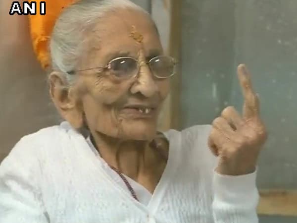 Gandhinagar (Gujarat): Prime Minister Narendra Modi’s mother Heeraben cast her vote in a polling booth in Gandhinagar as the voting for the second-phase of Gujarat Assembly elections began today.