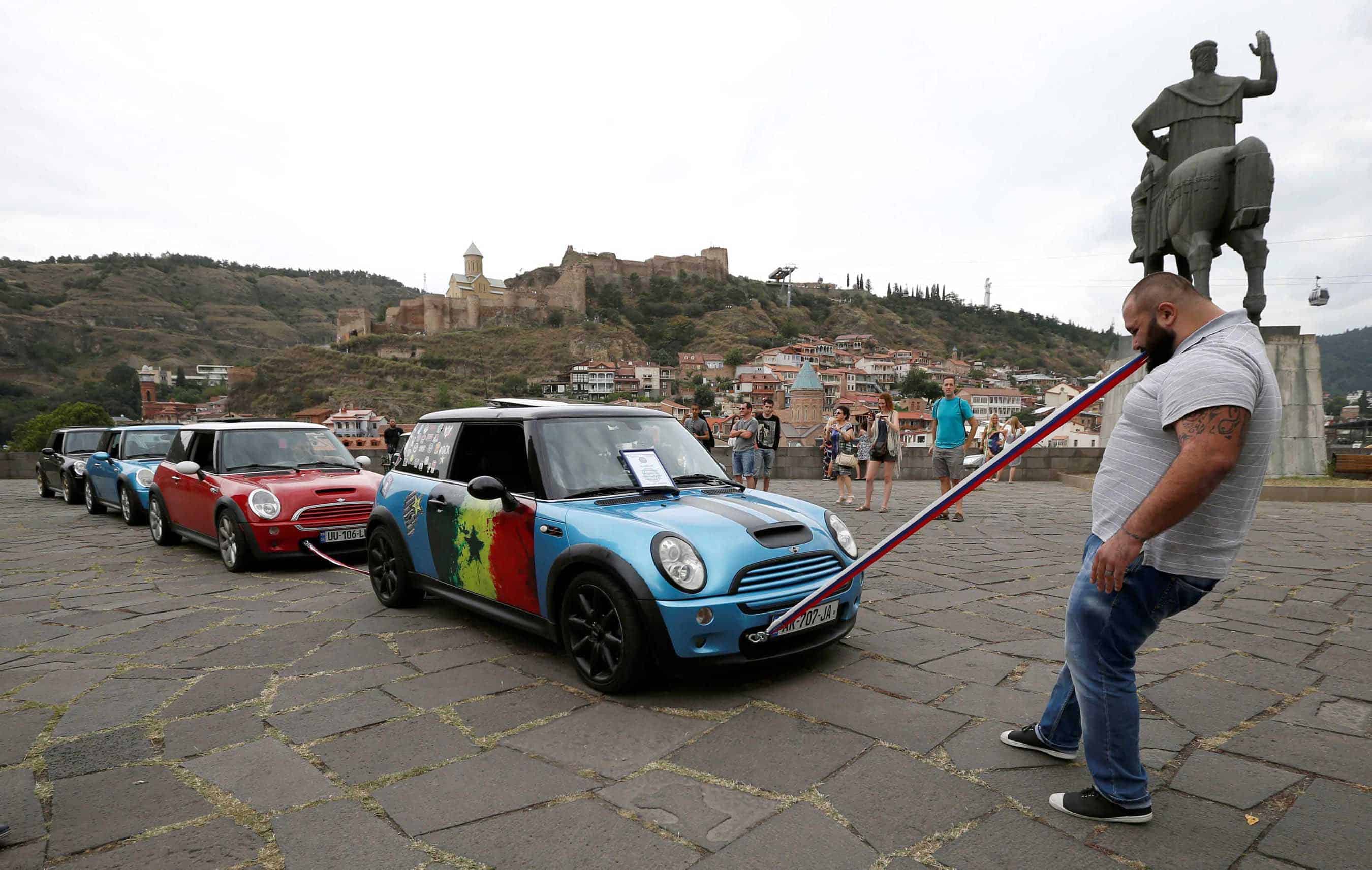 TBILISI, AUG 16:- Guram Ustiashvili, 22, pulls four cars with his teeth during an attempt to set a world record in Tbilisi, Georgia, August 16, 2016. REUTERS-20R