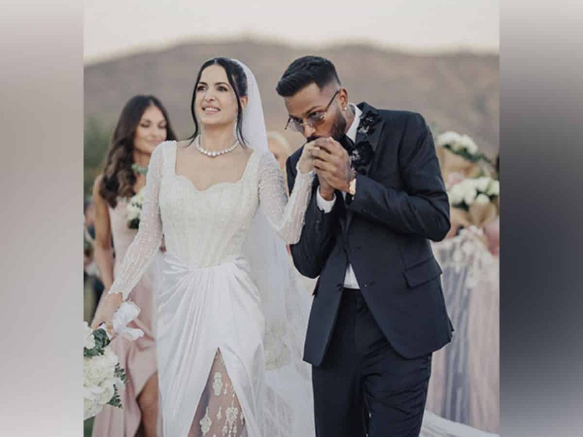 Natasa was dressed in a white gown as a typical Christian bride. She wore a pearl necklace and tied her hair in a bun. Hardik was dressed in a black suit. The pictures show Natasa and Hardik sharing a kiss, the couple exchanging kisses with their son Agastya, and Natasa walking down the aisle with her father and posing with bridesmaids and groomsmen.