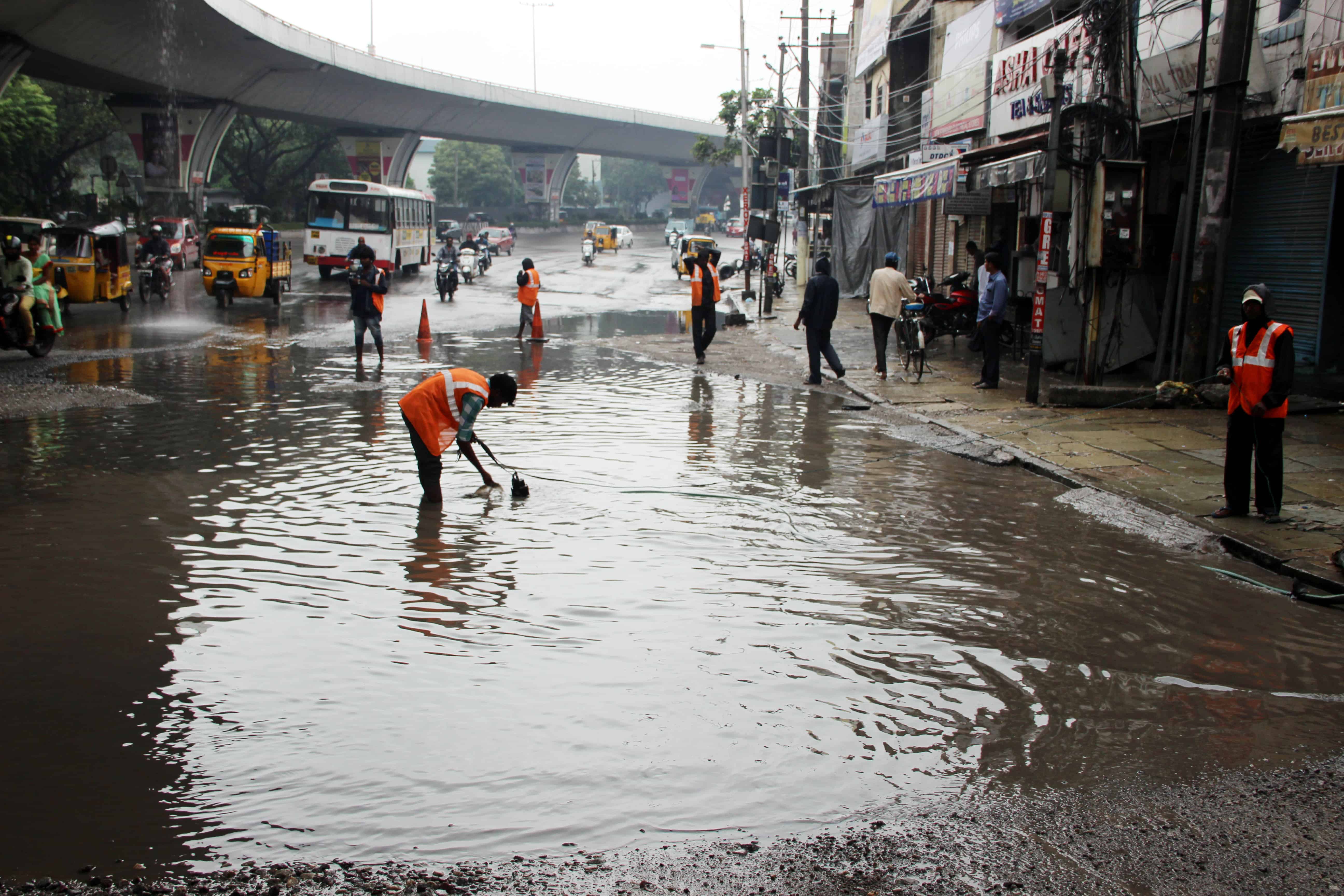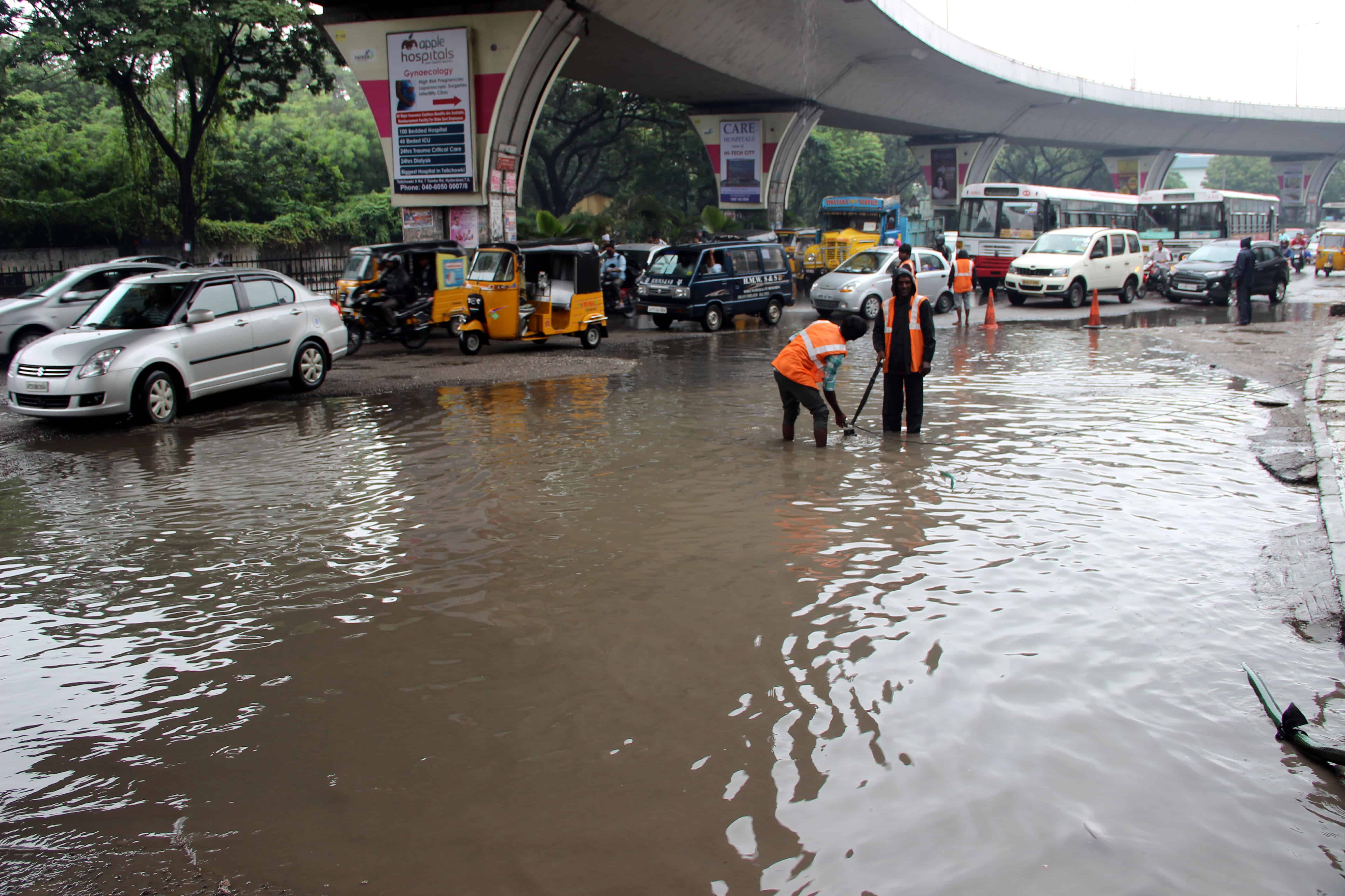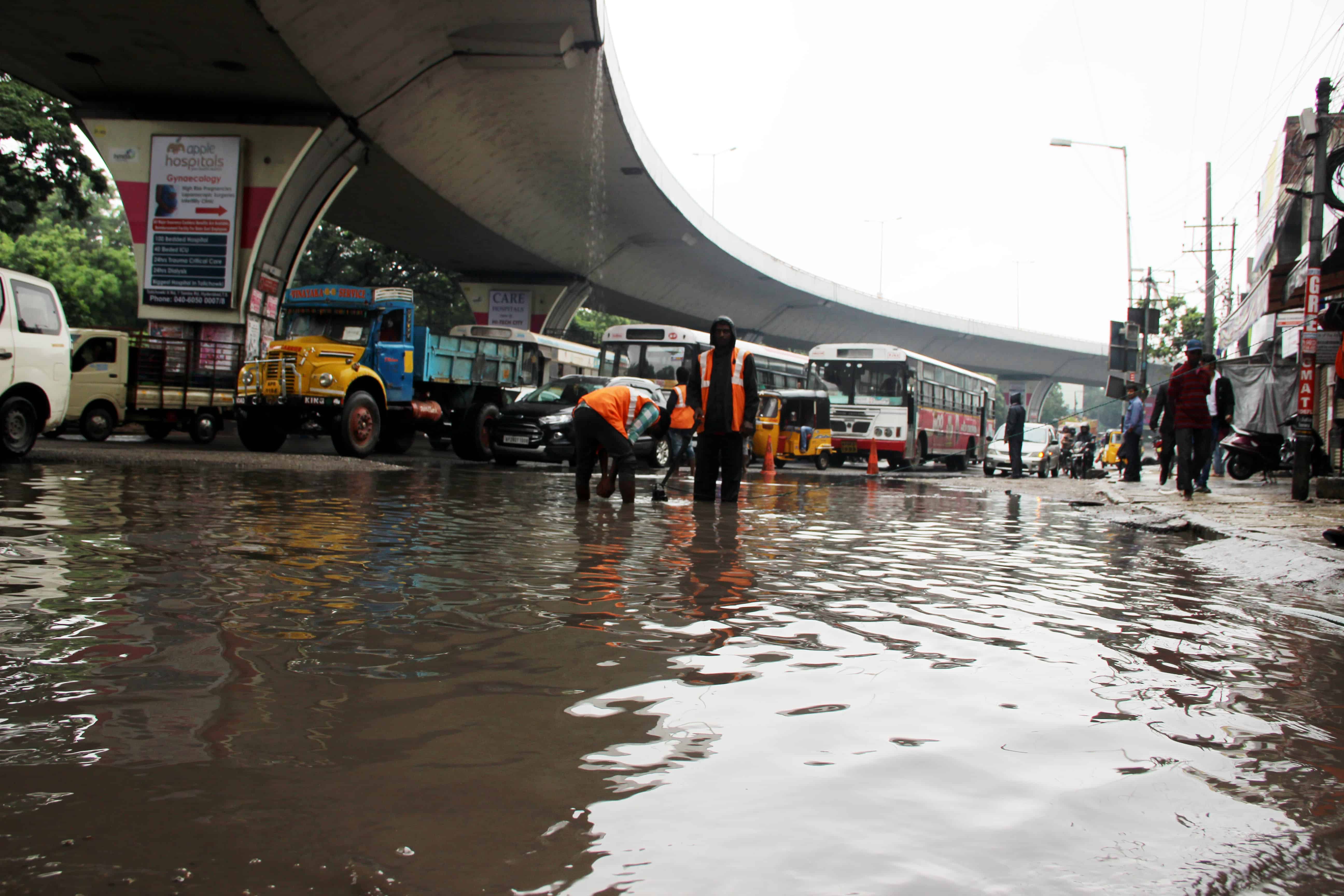 Ganesh visarjan came to a standstill as heavy rain continues to lash Hyderabad on Thursday. Low-lying areas were inundated, drain water gushed out of sewerage lines on main roads and cellar areas of apartments in colonies filled with rain and drain water. Photo:Laeeq