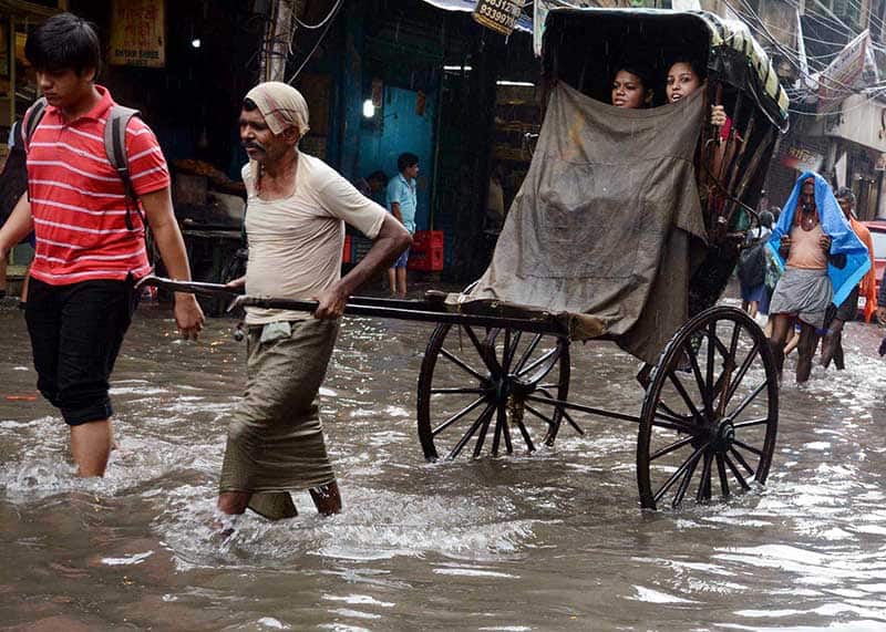 KOLKATA, SEP 3 (UNI):- A rickshaw puller ferrying people through water-logged during the heavy rain in Kolkata on Saturday. UNI PHOTO – 112U