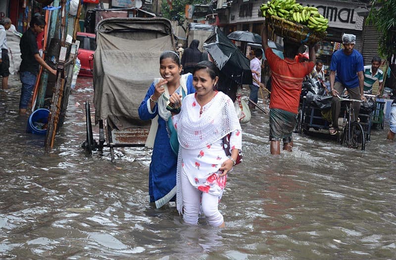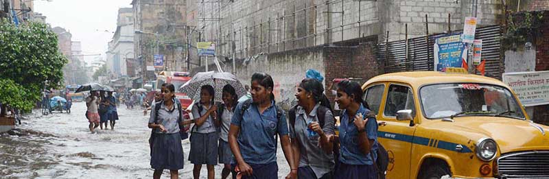 Girls wading through waterlogged road during heavy rain in Kolkata on Saturday. UNI PHOTO