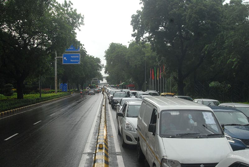 Vehicles snarl due to heavy traffic jam on Sardar Patel Marg near Dhaula Kuan, followig heavy rain in New Delhi on Wednesday morning. UNI PHOTO