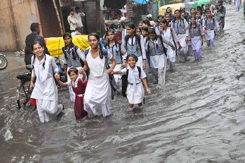 NEW DELHI, AUG 31 (UNI):- Students passing through water logged road in New Delhi on Wednesday. UNI PHOTO-74U