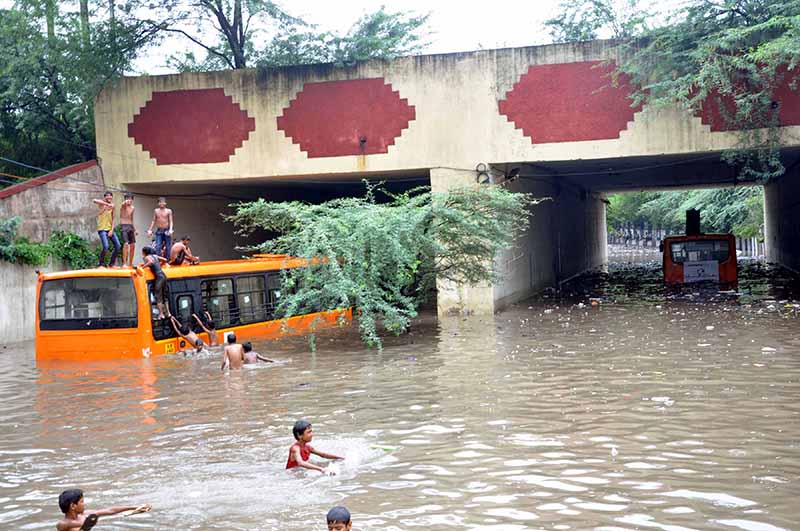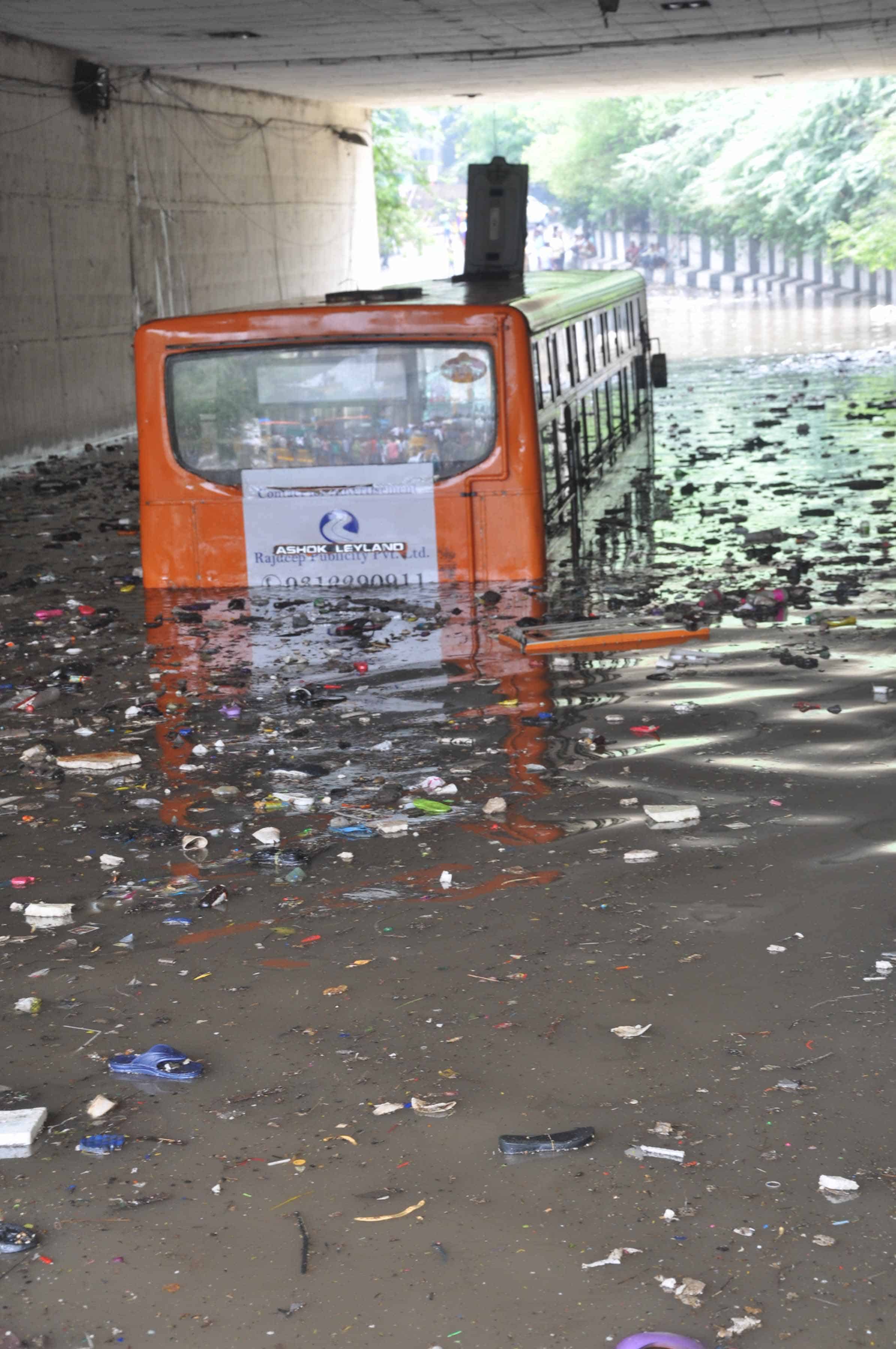 NEW DELHI, AUG 31 (UNI):- Bus stuck at a water logged road at Zakhira rail underpass in New Delhi on Wednesday. UNI PHOTO-76U