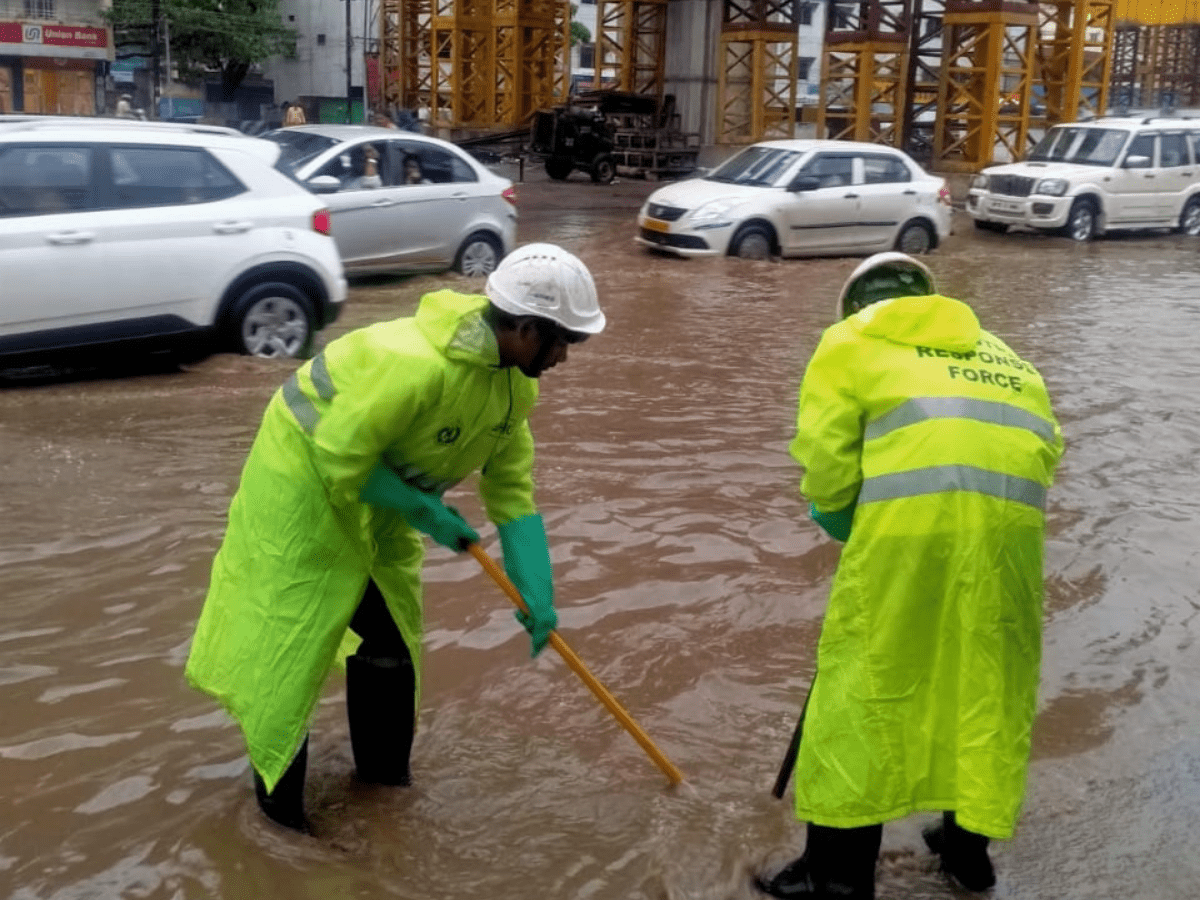 “DRF teams clearing water stagnation, tree falls and providing citizens assistance in wake of inundation caused by sudden cloud burst,” tweeted director, enforcement, vigilance, disaster management, GHMC.