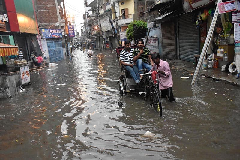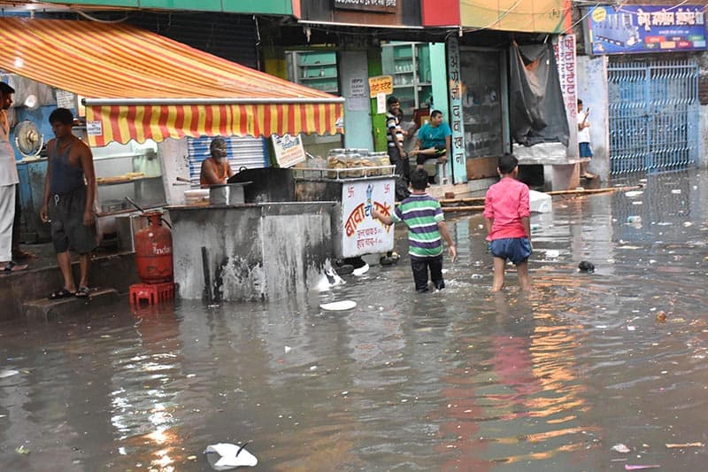 People crossing at a waterlogged road after heavy rains in Patna on Tuesday. UNI PHOTO
