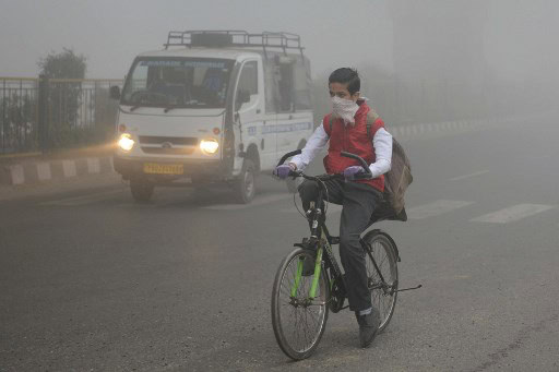 An Indian school boy cycles to school after three days off due to heavy smog in Amritsar on November 13, 2017.AFP