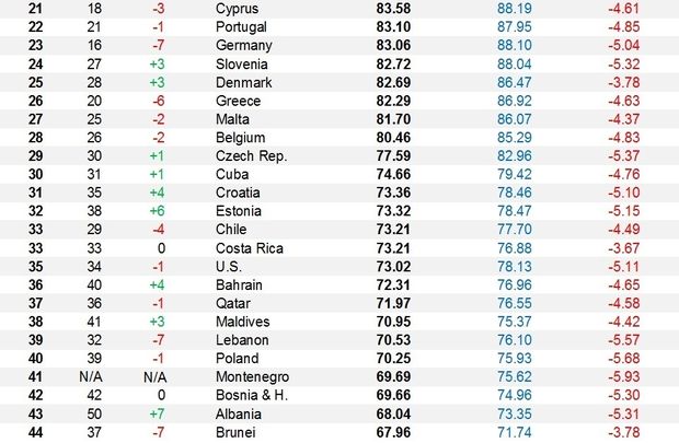 Among the top 10 countries, six of them were in Europe, with Italy ranking second. In contrast, the United States didn’t even break into the top 30, ranking at number 35, one notch worse than last year.