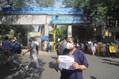 New Delhi, Oct 23 : Resident Doctors of the North Delhi Municipal Committee Medical College and Hindu Rao Hospital on Friday began an indefinite hunger strike against non-payment of salaries.