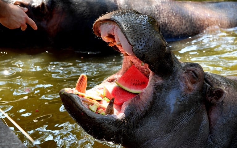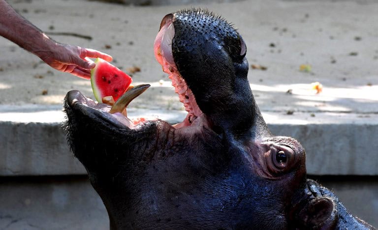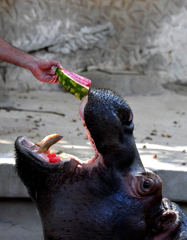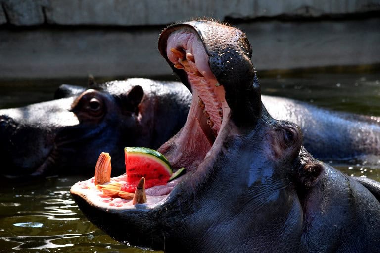 A hippopotamus eats frozen watermelon to cool off at the “Bioparco” zoo during a heat wave on July 25, 2018 in Rome. TIZIANA FABI / AFP