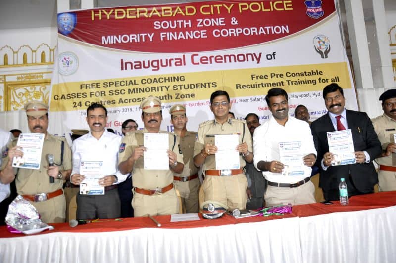 Hyderabad city police launches special coaching book for SSC candidates in collaboration with Minorities Finance Corporations and Tapasya Educational Institutions. In the picture City Police Commissioner Mr. V.V. Srinivas Roa, IPS, DCP South Zone V. Satyanarayana, Addl. DCP Md. Ghouse Mohiuddin, Mr. Sridhar Muppala, CA, Mr. Gampa Nageshwar Rao and others. (Pics. Mazher)