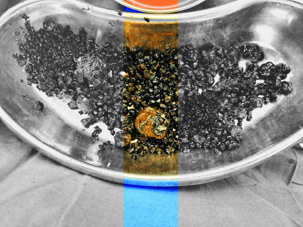 The main bile duct was opened, and approximately 250 gm of stones (exceeding 1000 in number) were laboriously removed by the surgeons using different techniques to extract bile duct stones from the proximal ducts and the main bile duct was joined with the intestine (Hepaticojejunostomy).