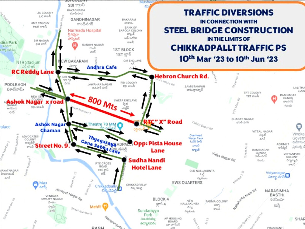 - Traffic coming from Indira Park towards RTC X road will be diverted at Ashok Nagar X road via Street No. 9, City Central Library, Sudha Nandi Hotel Lane, Chikkadpally main road.