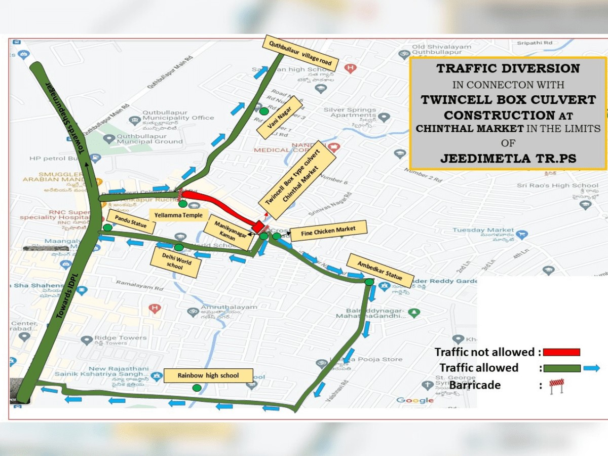 Hyderabad: Month-long traffic restrictions have been announced for GHMC works on the Twince Box culvert at Chintal Market.